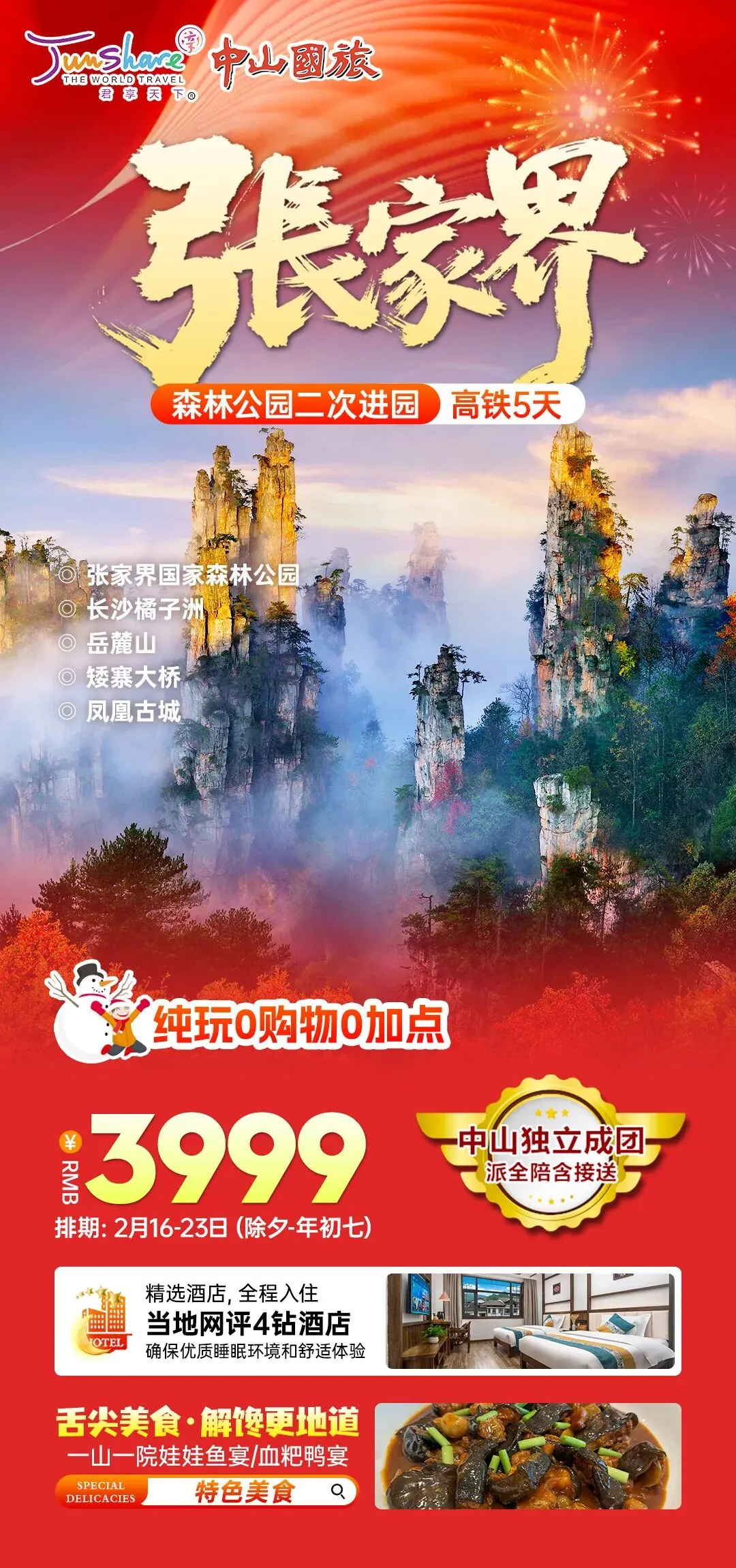 春节张家界!深度探秘张家界核心奇观,漫游长沙橘子洲头、岳麓山,畅游矮寨大桥,凤凰古城,沉浸于这片世界级山水与千年人文交织的仙境~