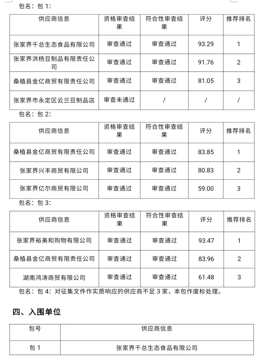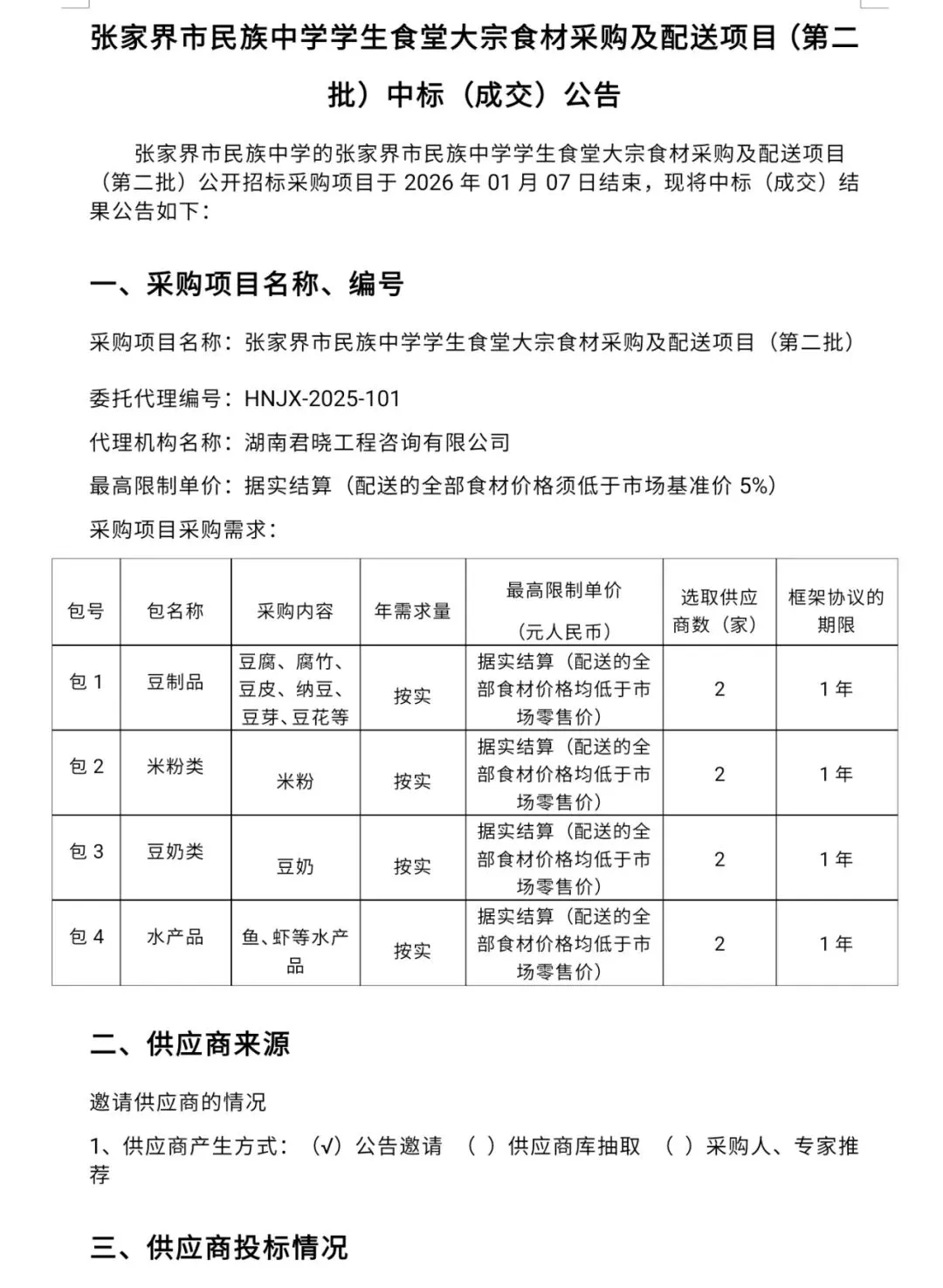 >张家界市民族中学学生食堂大宗食材采购及配送项目(第二批)中标(成交)公告