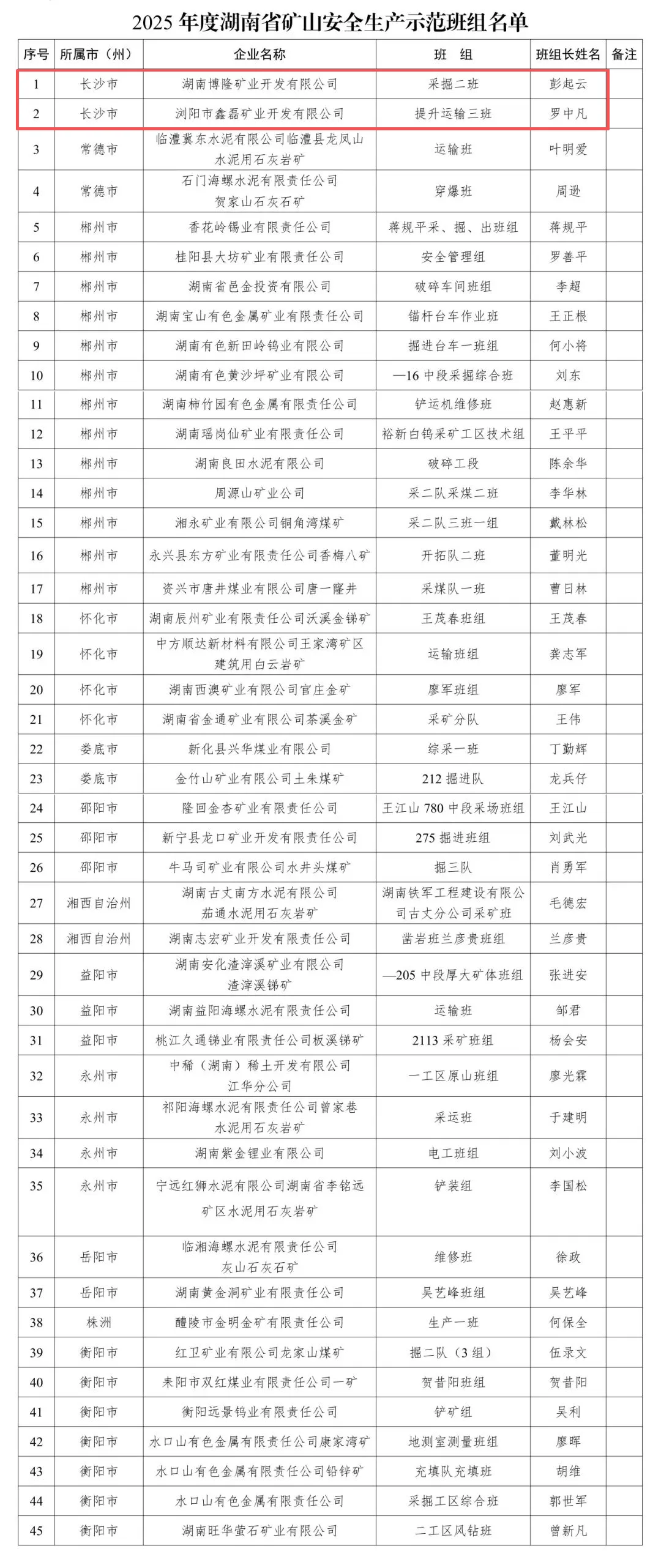 日前,省应急管理厅发布公告,长沙市湖南博隆矿业开发有限公司采掘二班、浏阳市鑫磊矿业开发有限公司提升运输三班被授予“2025年度全省矿山安全生产示范班组”称号。