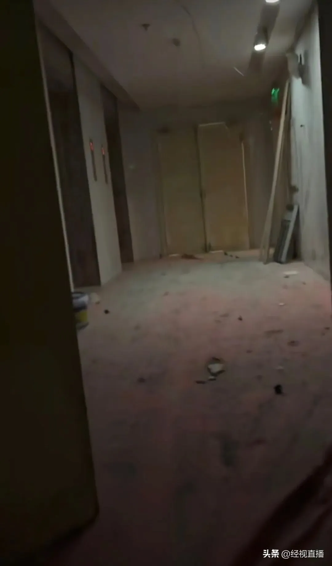 该网友发布的视频显示,电梯间灯光昏暗,地面未铺设地板或瓷砖,颜色深浅斑驳,墙角还随意堆放着杂物。