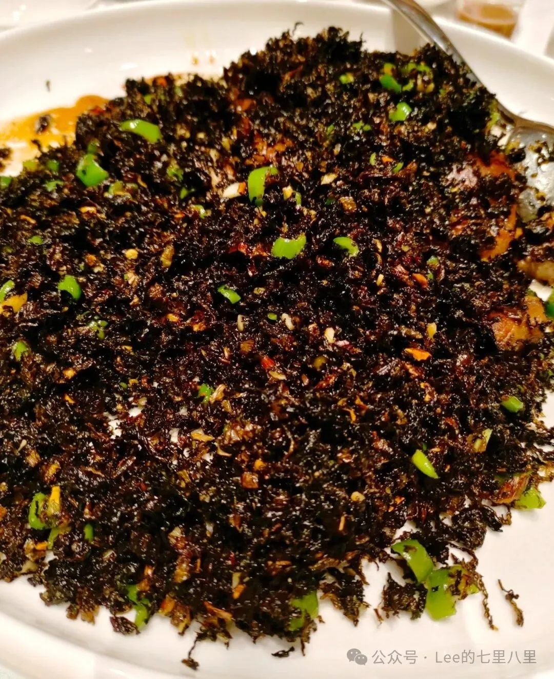 梅菜香猪肉,它跟平时吃得扣肉蒸酸菜不一样,这个是蒸得很烂很入味的一整块五花肉,上面的酸菜(梅干菜)是用油爆过一下的,加上碎青辣椒炒了一下,再盖到肉上的,这个梅干菜就非常香,很好吃。跟蒸肉一起吃,梅干菜的焦香配上猪肉的软烂,很上头,哈哈。这个被炸得有点小干的梅干菜跟肉一起咬下去,肥肉部分就显得肥而不腻。很好!
