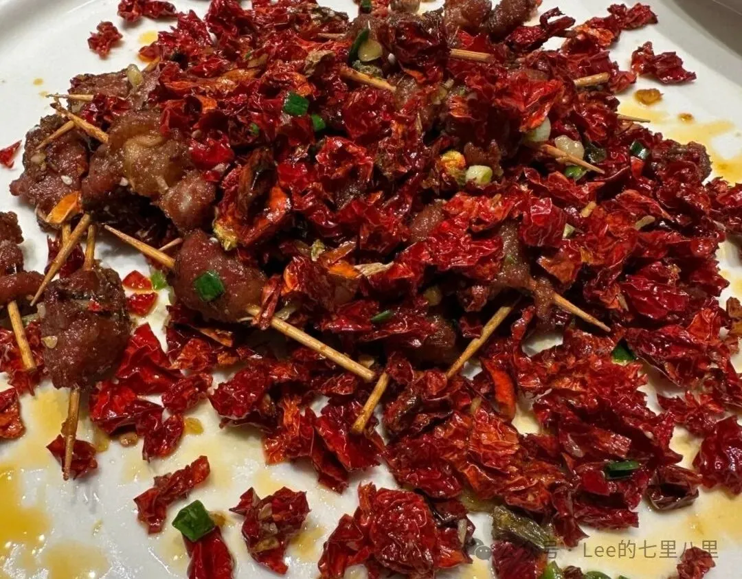 牙签烤羊肉,焦香,干辣椒主要是提香,不很辣,肉也比较嫩,小朋友们喜欢。