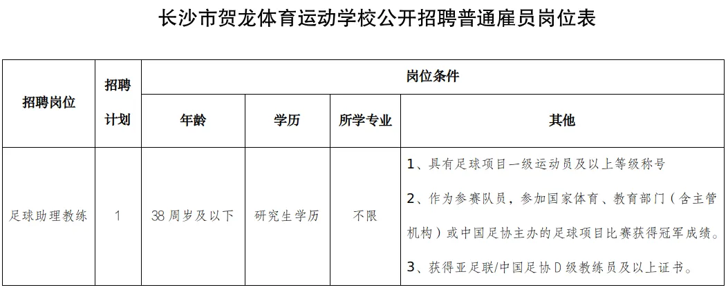 见附件1 《长沙市贺龙体育运动学校公开招聘普通雇员岗位表》