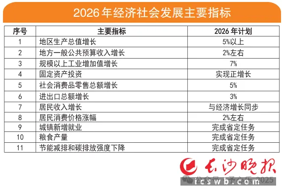 2026年是中国共产党成立105周年,也是“十五五”开局之年,做好今年工作意义重大。全市经济社会发展主要预期目标是:地区生产总值增长5%以上,地方一般公共预算收入增长2%左右,规模以上工业增加值增长7%,固定资产投资实现正增长,社会消费品零售总额增长5%,进出口总额增长3%,居民收入增长与经济增长同步,居民消费价格涨幅2%左右,城镇新增就业、粮食产量、节能减排和碳排放强度下降完成省定任务。