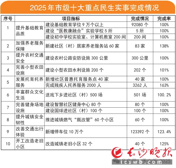 七是持之以恒增进民生福祉。提升公共服务品质。20件省、市重点民生实事圆满完成。城镇新增就业完成省定任务,城镇调查失业率控制在5.5%以内。中小学生体质健康合格率、优良率提前三年完成省定目标,长沙市一中、师大附中、雅礼中学新校区建成招生,全国第八届中小学生艺术展演活动在长举办,国家特殊教育改革实验区获批。医疗卫生服务体系不断健全,市公共卫生救治中心(二期)、市二医院建成投用,国家重大传染病防治基地加快建设,获批中央财政支持公立医院改革与高质量发展示范项目。成功举办市第十一届运动会、长沙网球公开赛、全民健身运动会,入选首批国家促进体育消费和赛事经济试点城市。提质建成市级工人文化宫4个。流失海外79载的长沙子弹库战国帛书回归,时隔29年长沙湘剧演员再获中国戏剧表演艺术最高奖梅花奖。加强民生兜底保障。多层次社会保障体系提标扩面,最低生活标准、特困人员救助供养标准每月分别提高至770元、1001元,发放低保、特困、临时救助资金超10亿元。五类特殊困难老年人意外险实现全覆盖,新建居家养老服务站点83家、示范性社区普惠托育服务点40家,千人托位数达5.03个。“保交楼”经验全国推广。筑牢城市安全防线。超额完成省定化债任务。城市运行安全常态隐患查整机制获国务院安委办推介。安全生产治本攻坚三年行动扎实开展,烟花爆竹、道路交通、人员密集场所、建筑施工、学校周边等专项治理成效显著,全市安全事故起数、死亡人数分别下降6.1%、9.2%。积极应对多轮强降雨和罕见旱情,森林火情数量下降48%。“12345热线+信访”融合联动机制不断健全,初次信访事项一次性化解率达95.84%,征集办理人民建议1.1万余条。社会治安防控体系持续优化,刑事警情逐年下降,社会大局平安稳定。国家安全、档案史志、港澳台事务、移民、离退休干部、民族宗教、统计、机关事务、保密、邮政、供销等工作开创新局面,关工委、工会、共青团、妇联、科协、文联、侨联、社科联、残联、红十字会、慈善会、老龄委、计生协等工作取得新成绩,地震、气象、水文为长沙发展作出新贡献。