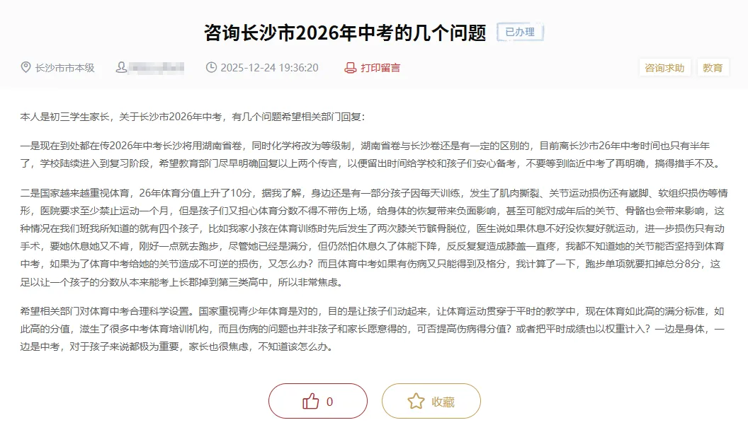近期,“百姓呼声”平台有网友咨询26中考问题,得到了官方回复: