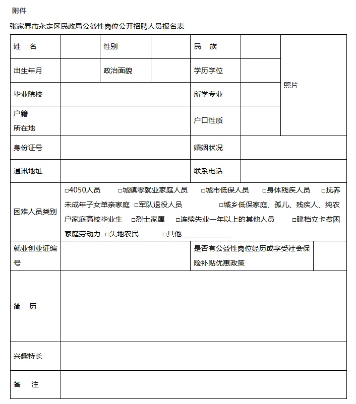 附件:张家界市永定区民政局公益性岗位公开招聘人员报名表