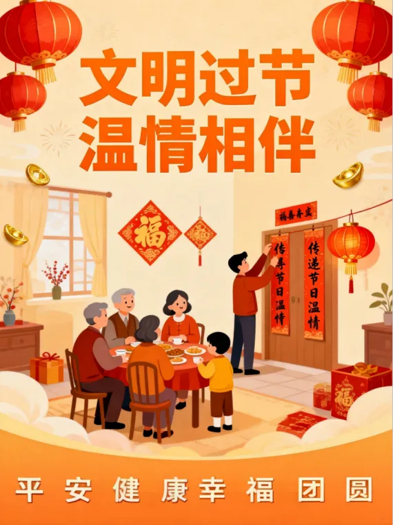 节日的喜庆不只来自烟花爆竹,更源于家人团聚、平安健康和文明祥和。倡议大家通过悬挂灯笼、张贴春联、家庭团圆、文明祝福等方式表达节日喜悦,让节日更安全、更温馨、更有意义。