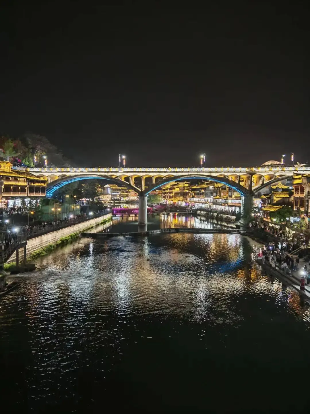 明月清空,星辉与灯光映照,彩彻流水,一碧如洗,远山如黛,江面薄雾轻浮,人流如潮,飘飘欲仙,逸兴盎然。立足虹桥,亲临跳岩,欣赏吊脚楼,体验古城墙,一个静美的夜晚,一个腾飞的时空。行随心愿,心愿行随,心与心交,行与行伴,环境陶冶的情操代代传扬。