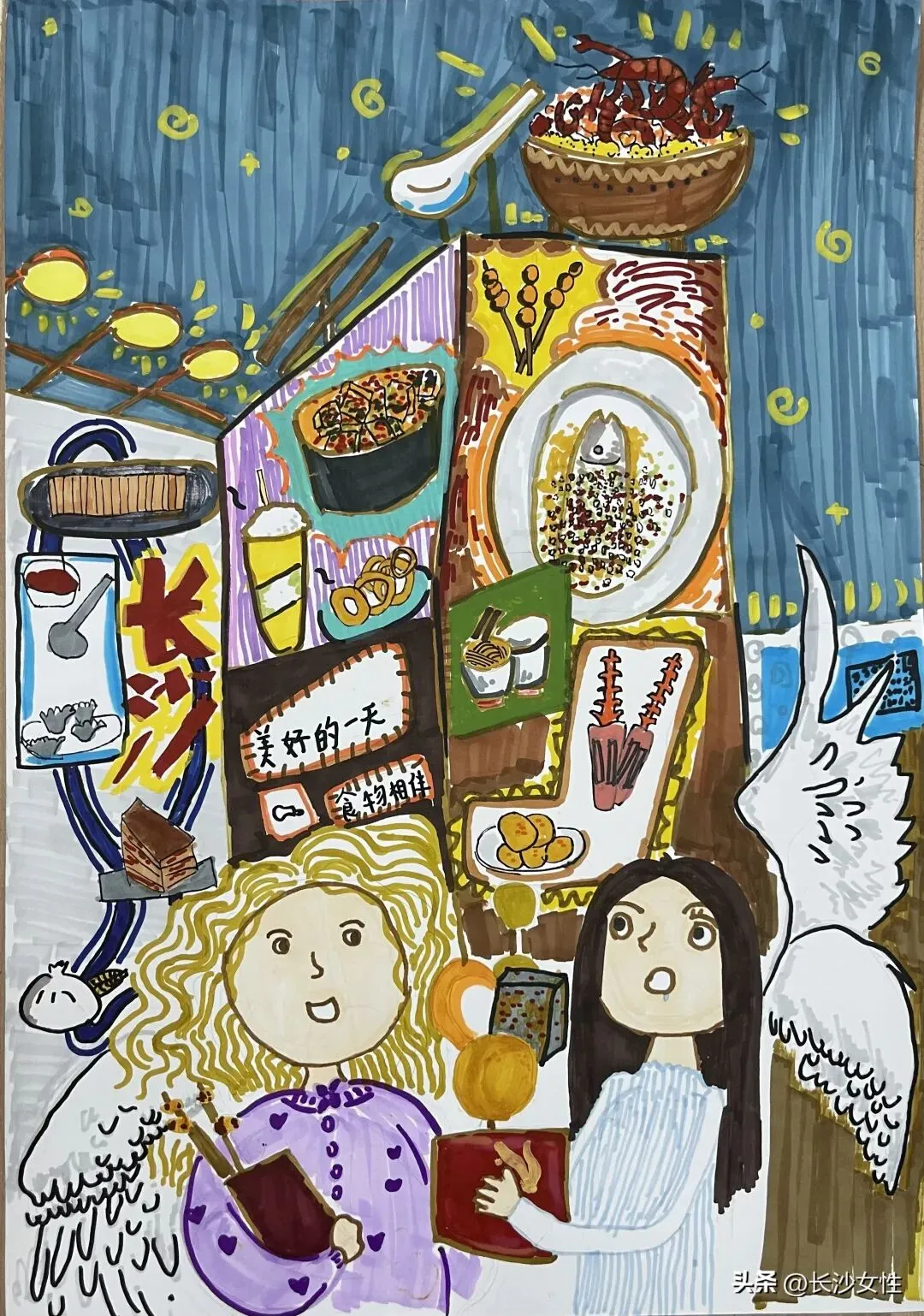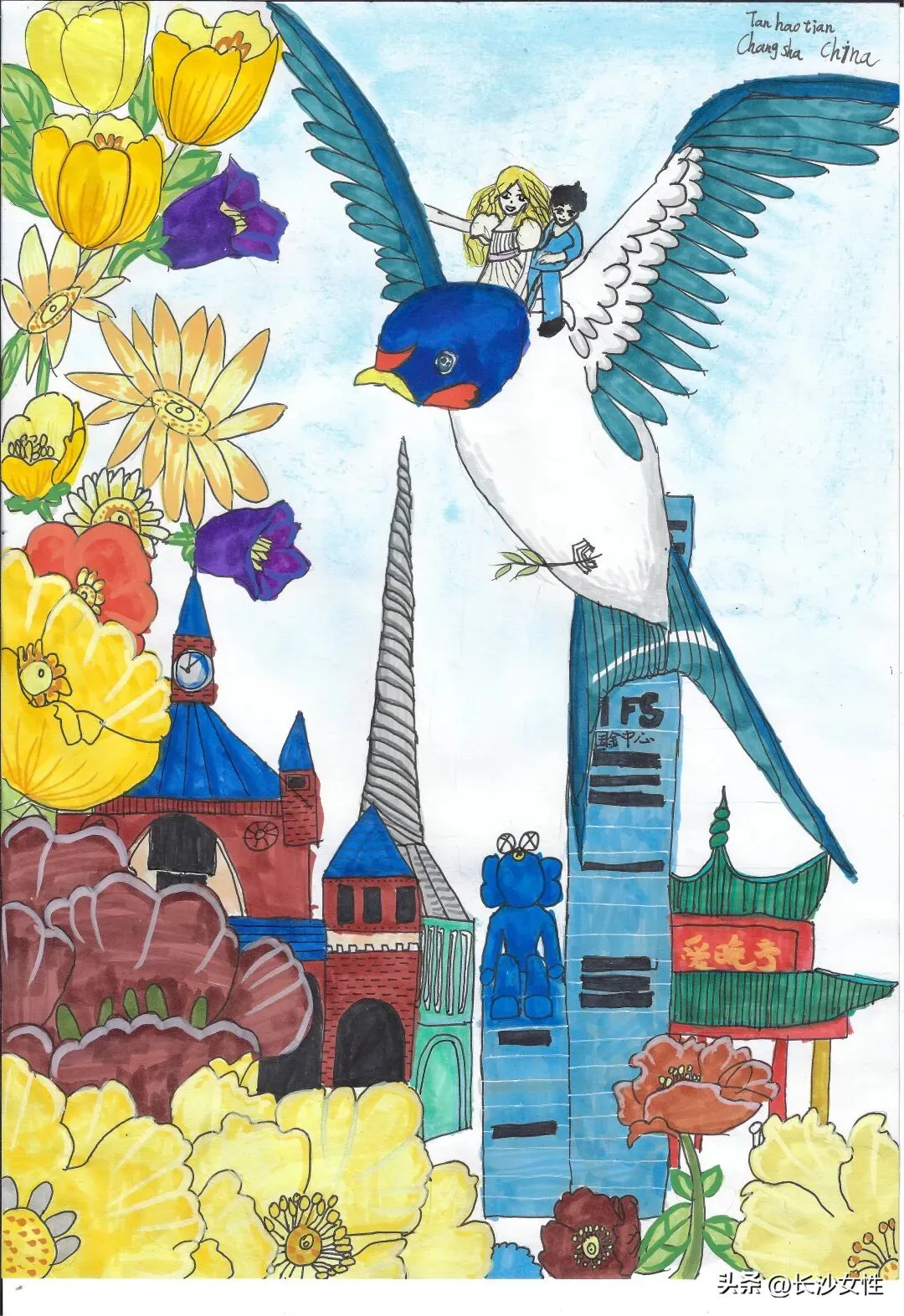 在此次展览的长沙作品里,藏着孩子们最质朴的心意。有的将橘子洲、岳麓山绘入“希望天使”的裙摆,让湖湘地标随童真翅膀飞向远方;有的画下中外孩子共放纸鸢的画面,把跨国友谊藏进春风里;还有的以IFS高楼、火宫殿等城市符号为底色,让长沙的烟火气与创意感在画纸上交融。这些作品里,水彩晕染的是童年的烂漫,素描勾勒的是真诚的联结,每一笔色彩都带着“长沙温度”。这些带着生活温度与城市印记的作品,不仅展现了长沙青少年的艺术感知力,更传递出跨越语言的善意与希望,得到展览负责人的充分认可。