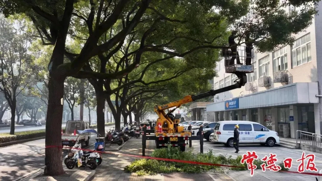 据常德市气象台报道,预计下一周常德市将出现寒潮雨雪天气,气温骤降并伴有明显降雪。为提前防范冰冻雨雪天气引发行道树倒伏、断枝等安全隐患,近日,常德市园林绿化服务中心绿地养护所抢先行动,在市城区武陵大道、洞庭大道、朗州路等重点路段,对大型香樟等常绿乔木开展疏剪作业,筑牢市民出行安全“绿色屏障”。