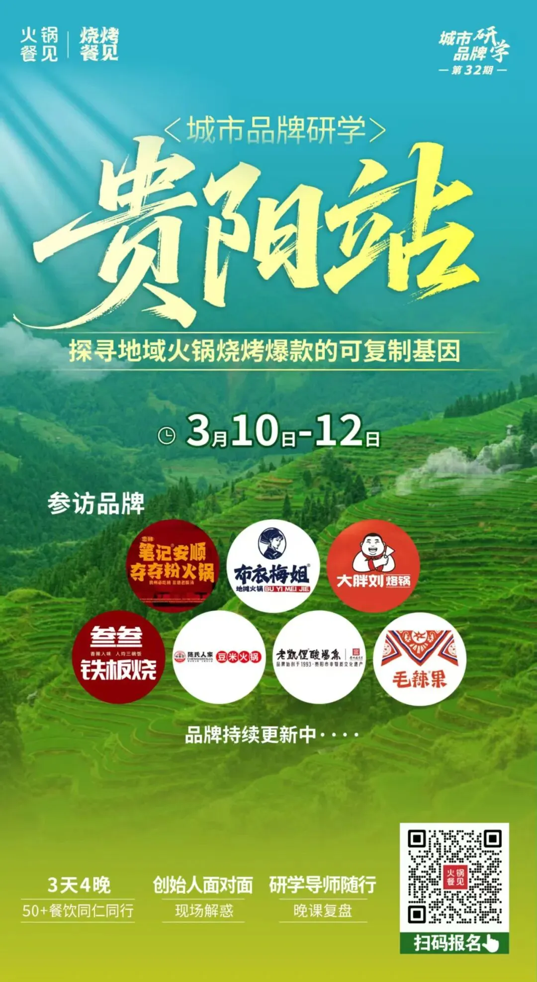 长沙研学虽已结束,但学习之旅仍在继续。3月10日至12日,餐见品牌研学将走进贵州,深入探访陈氏人家豆米火锅、笔记安顺夺夺粉火锅、布衣梅姐地摊火锅、大胖刘烙锅、叁叁铁板烧、老凯俚酸汤鱼、毛辣果贵州虾酸火锅等特色品牌,一同揭秘爆款背后的经营逻辑!
