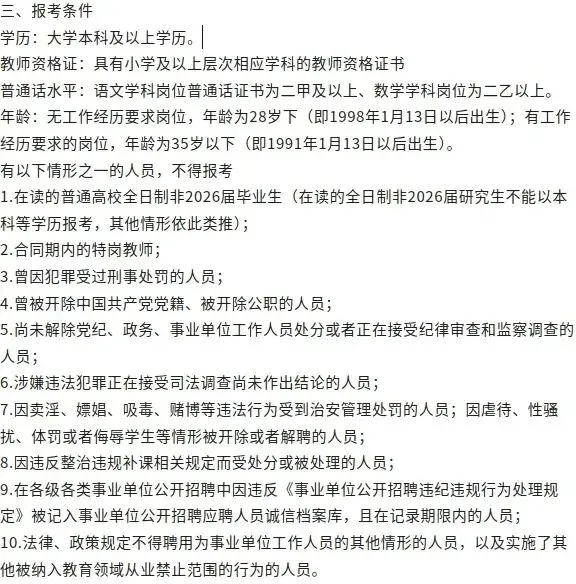3.普通话水平:语文学科岗位普通话证书为二甲及以上证书、其他岗位为二乙以上。