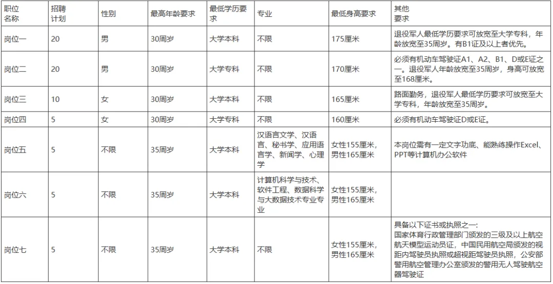 5、报考岗位二、岗位四,需提供相应机动车驾驶证及复印件;报考岗位七须提供国家体育行政管理部门颁发的三级及以上航空航天模型运动员证,中国民用航空局颁发的视距内驾驶员执照或超视距驾驶员执照,公安部警用航空管理办公室颁发的警用无人驾驶航空器驾驶证,数据分析师证,计算机四级及以上的证照之一及相应复印件。