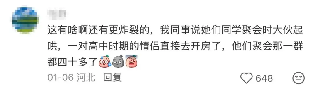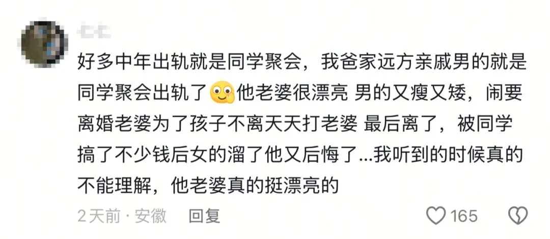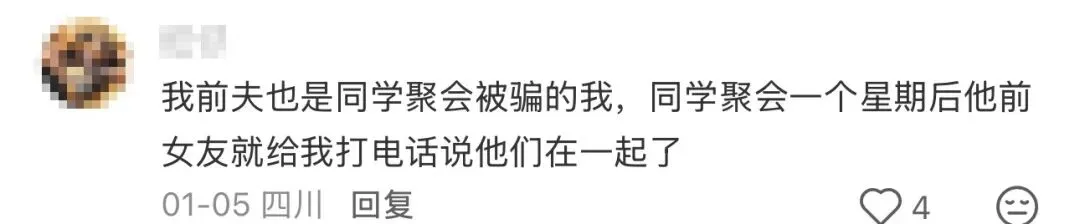 评论区里,也有不少网友分享了身边炸裂的真实经历:“前夫参加同学聚会一周后,他前女友就打电话来,说他们在一起了。”