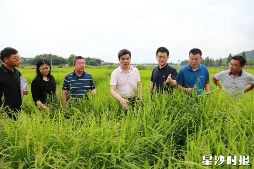 柏连阳院士团队在长沙市粮食生产 “四高”试验示范片春华核心基地调研指导。春华镇供图