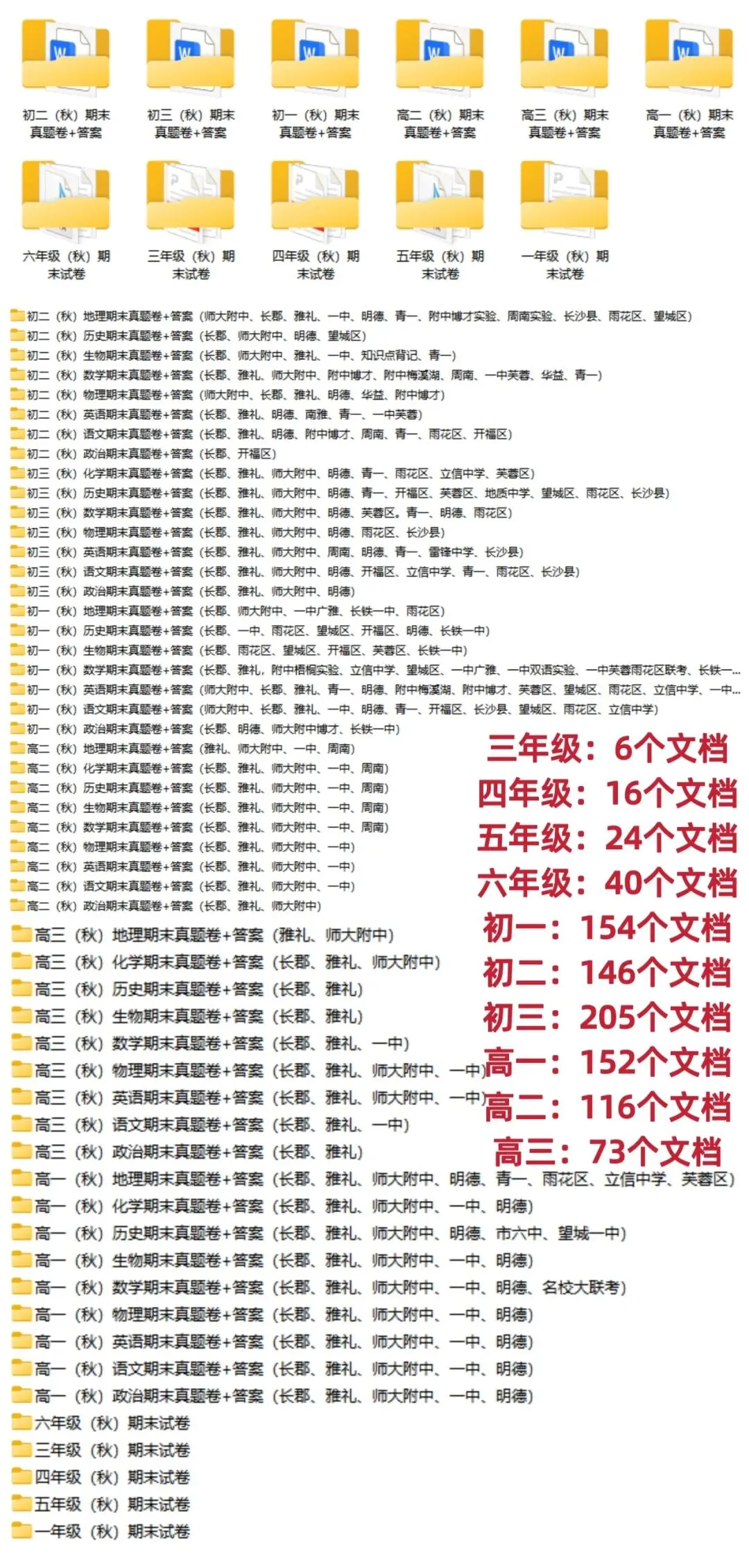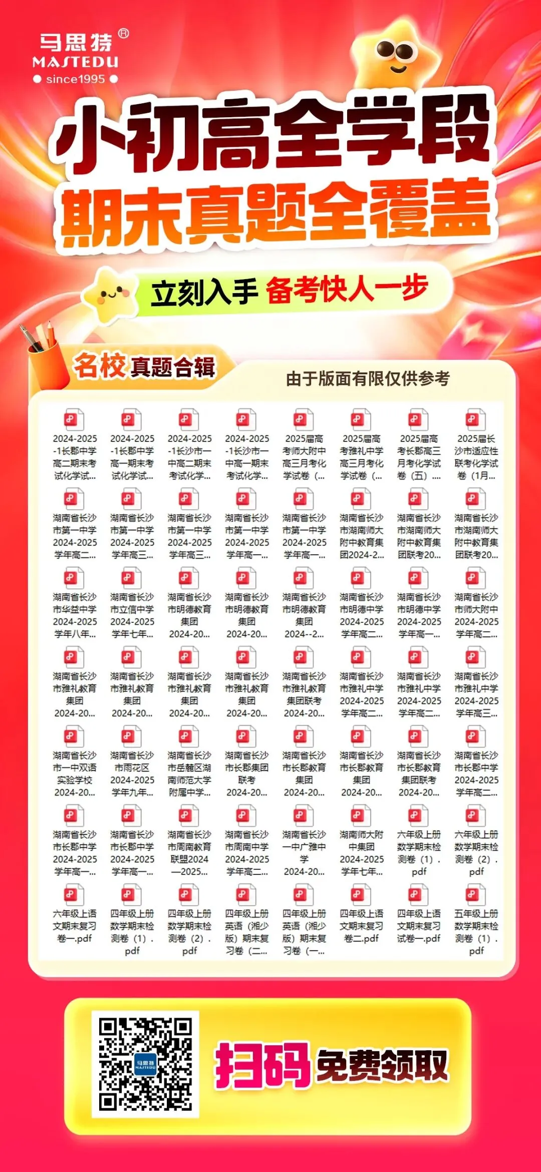 梨子老师整理长沙名校小学初中高中期末真题汇编,涵盖 小学以及七年级上册、八年级上册、九年级上册、高一上册、高二上册、高三上册全科内容,现已全面整理完毕!每一份都是精编高清版本,附带答案解析,帮助孩子精准复习、轻松应考!