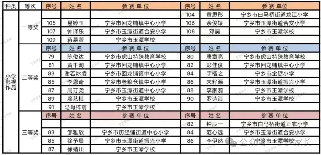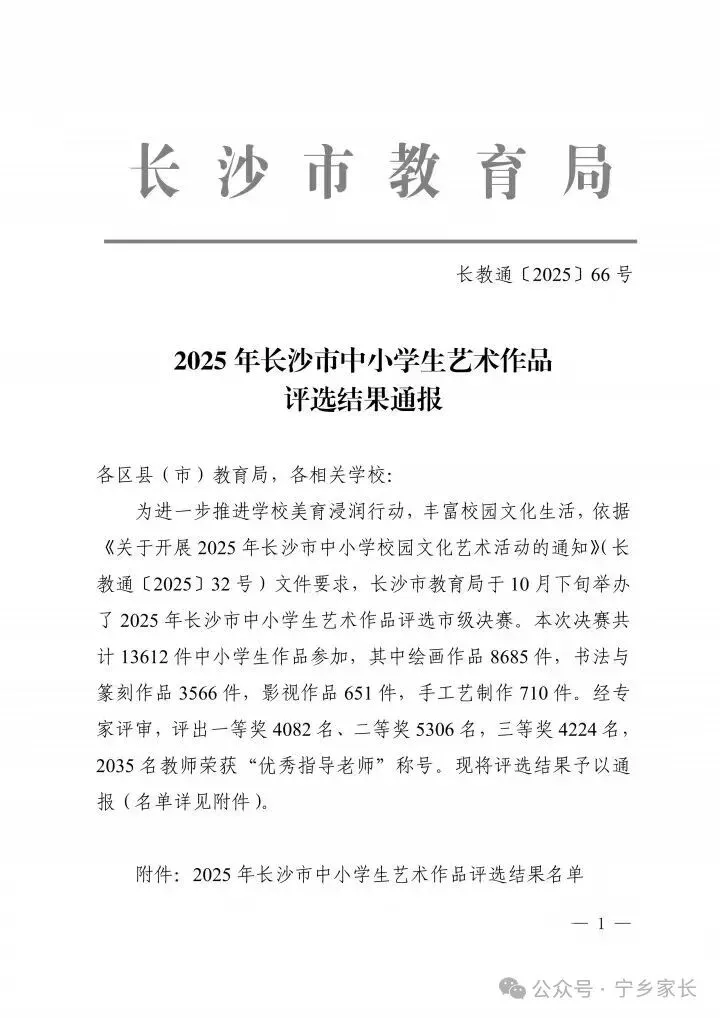 2025年长沙市中小学生艺术作品评选宁乡获奖名单根据长沙市教育局《2025年长沙市中小学生艺术作品评选结果通报》整理。“宁乡家长”坚持传递教育中的美好,分享美好教育。我们一起为获奖的孩子鼓掌祝贺,愿每个孩子都能健康快乐成长!