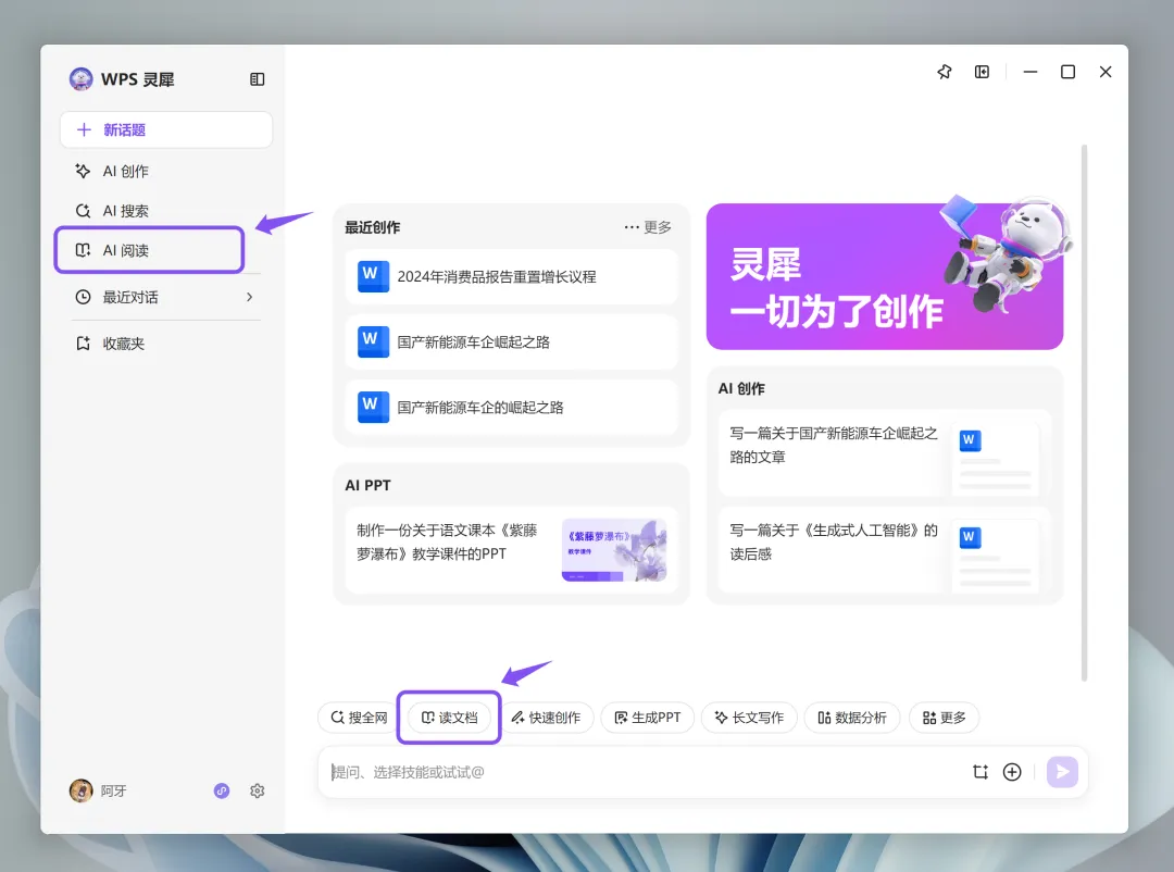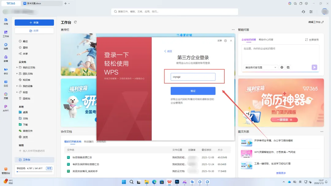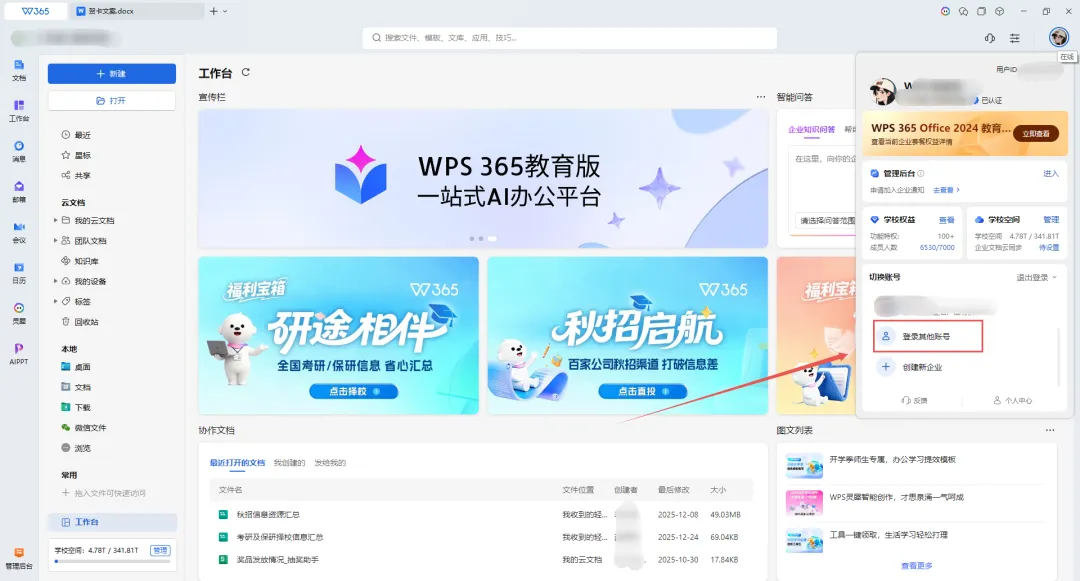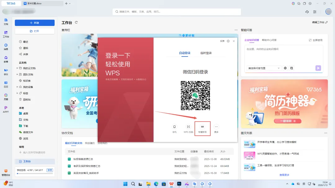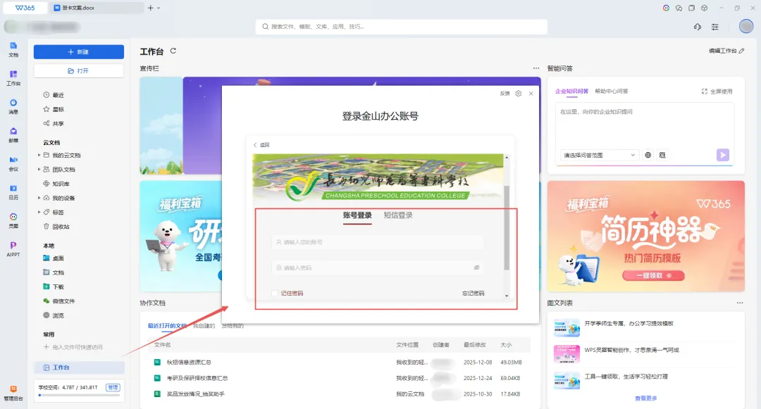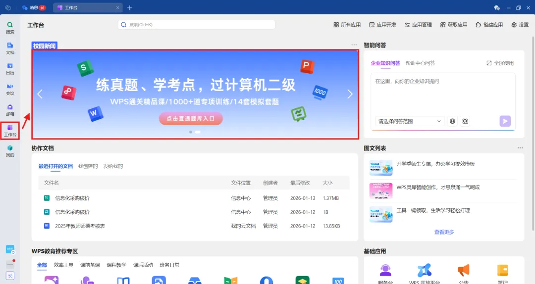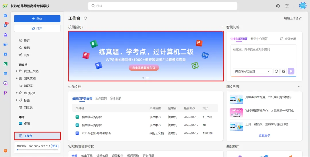 登录长沙幼儿师范高等专科学校专属校园账号后,进入WPS Office PC端工作台,点击图示宣传栏处即可领取计算机一/二级备考题库权益。具体领取步骤同WPS协作内的领取步骤一致。