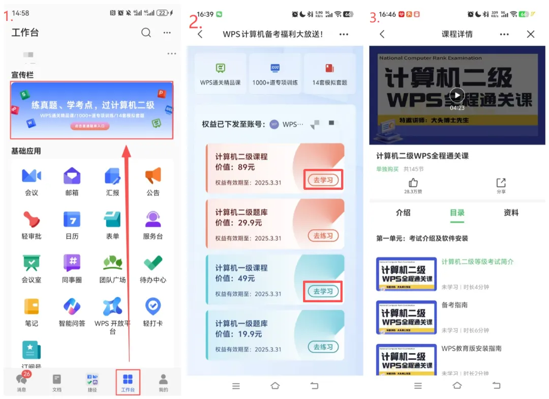 tips:教学平台入口需要在工作台宣传栏处领取完题库权益后,才能通过此入口进行学习(macOS系统暂不支持计算机二级题库使用,可前往WPS协作移动端进行视频学习)。