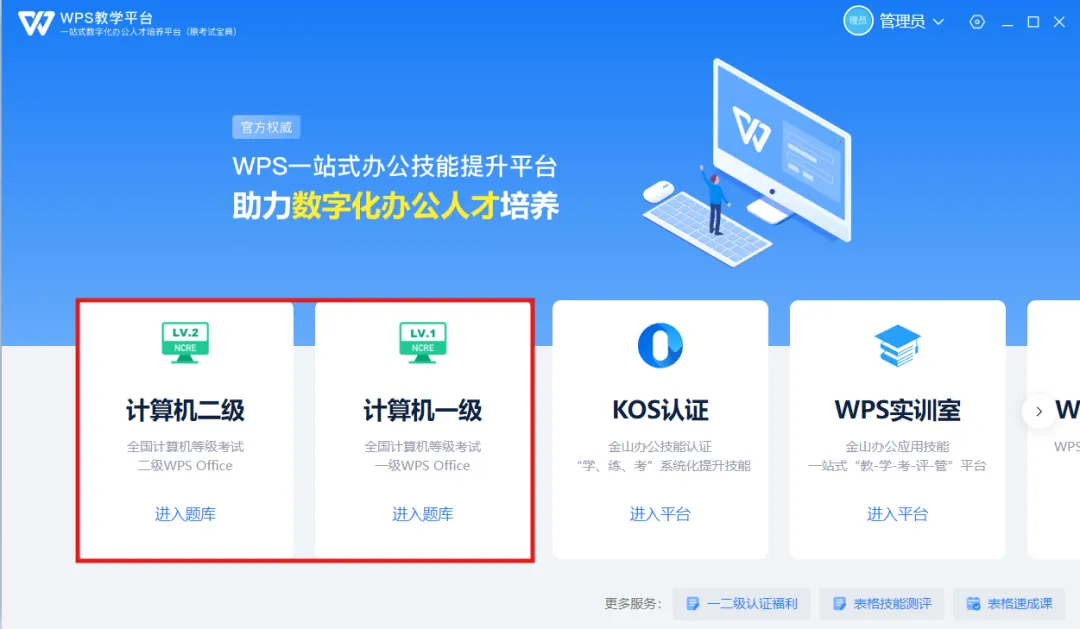 PC端登录协作后,进入工作台,点击题库宣传栏入口即可跳转进入领取界面,领取计算机一/二级备考题库权益。