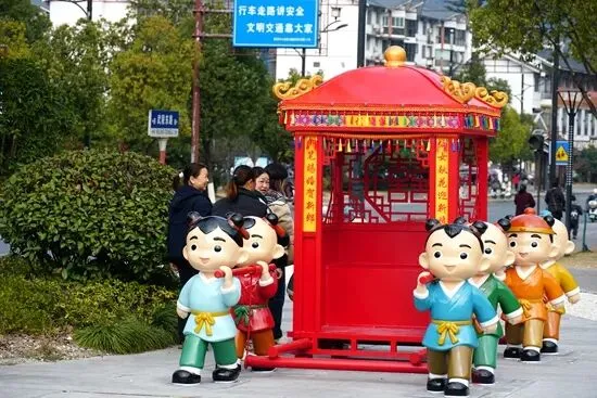 漫步园区,土家花轿朱红点缀,不少游客驻足合影,感受传统婚俗文化的独特魅力;“仙女献花”“御笔赐婚”将自然景观与婚恋祝福巧妙结合,以创意装置再现浪漫意象;“甜蜜的风吹到了武陵源”多向指示牌、“百年好合”造型座椅、“幸福一家人”秋千等设施充满温馨感,既传递了夫妻共育、家庭共担的科学育儿观,又以“莫让彩礼绑架婚姻”等标语,引导大众树立理性、文明的婚育观念。