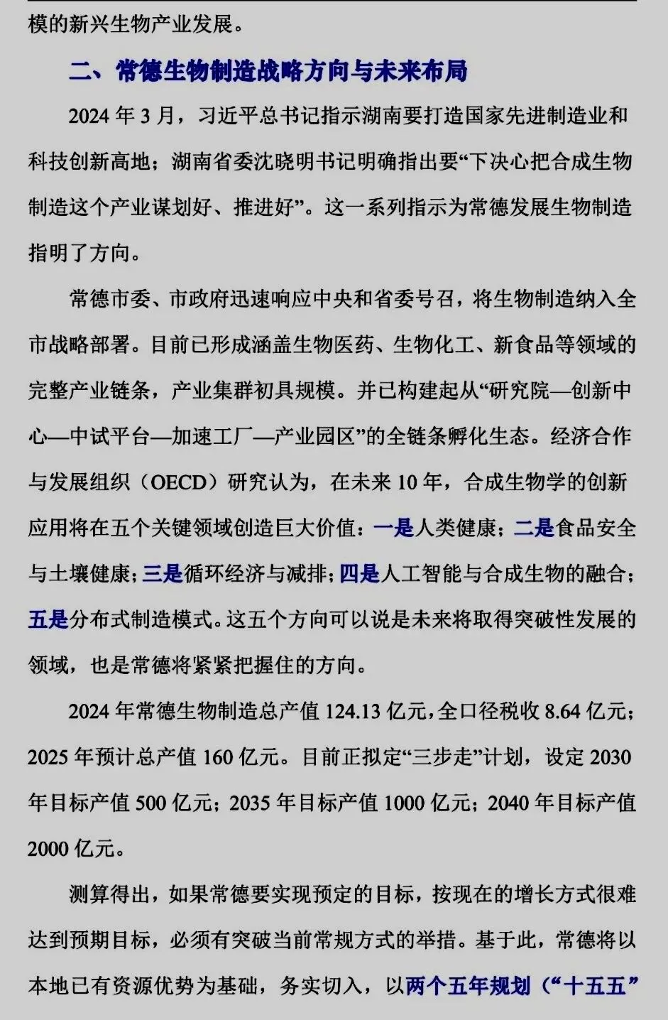 常德定位:积极响应中央和湖南省委(打造国家先进制造业高地、推进合成生物制造)号召,将生物制造纳入全市战略。2024年产业总产值124.13亿元,目标到2040年达到2000亿元。