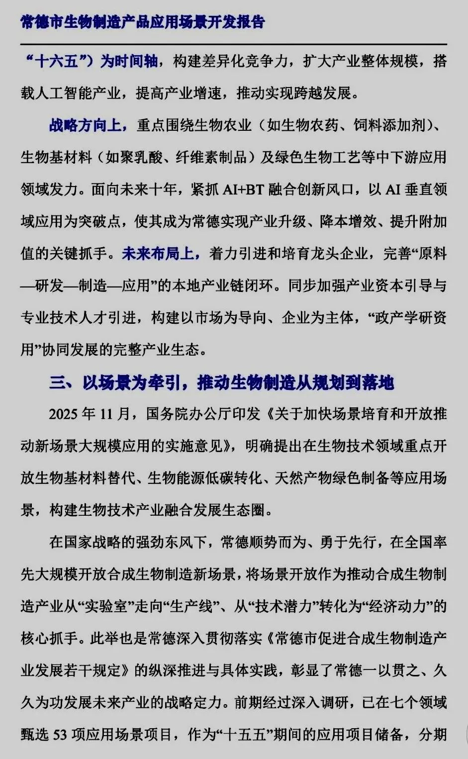 本报告系统阐述了常德市发展生物制造产业的战略背景、发展目标,并重点围绕七个具体领域,规划了以应用场景为牵引的落地路径。