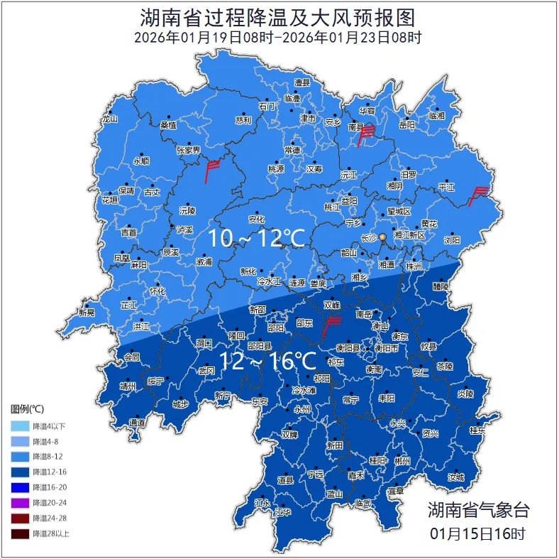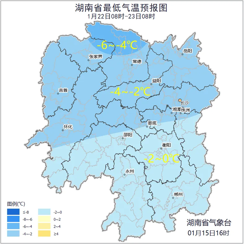 1月16日至18日全省大部分地区以阴雨天气为主,其中16日怀化中部局地中到大雨;19日至22日湖南将出现今年首场寒潮和低温雨雪冰冻天气过程。具有以下特点: