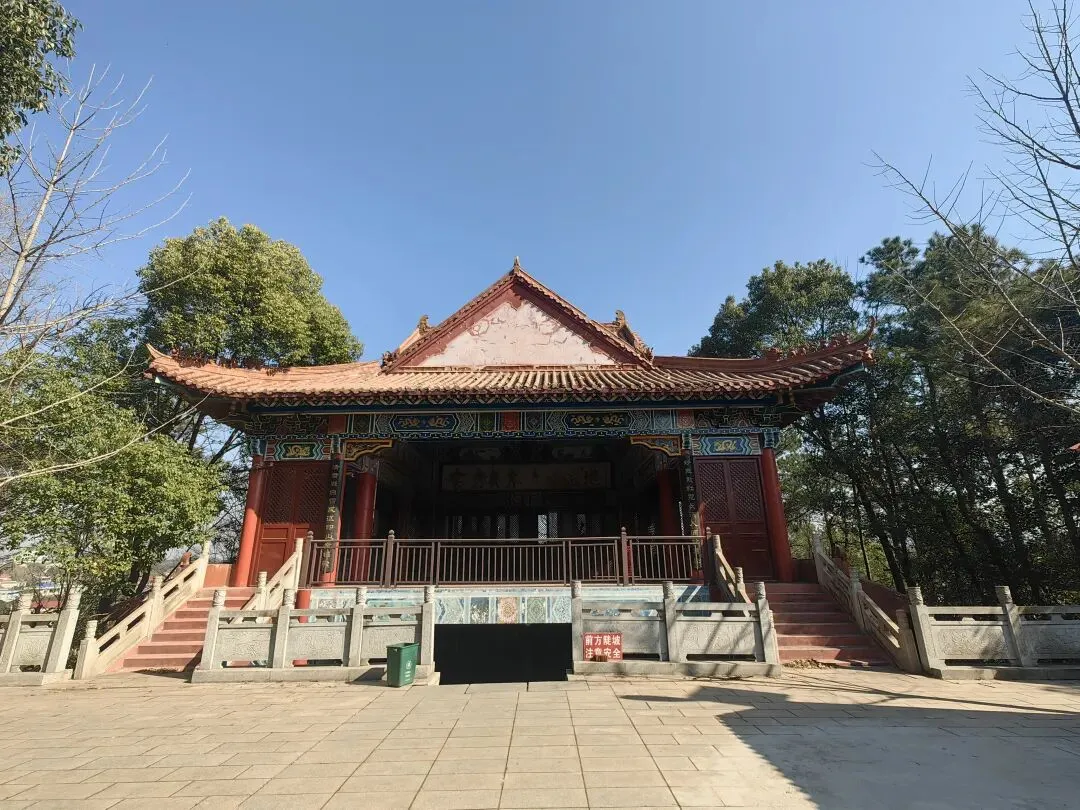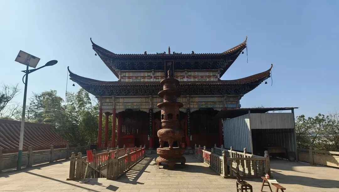 一道石阶笔直地向上延伸,像谁往山顶抛了一条灰白的带子。那么长,那么陡,静静悬在树影间,竟有些天梯似的恍惚。快到山顶时,竟从一座吊脚楼般的台基下穿过,“钻”出来,才发现仿佛是从大戏台肚子里走出的。再抬头,已站在殿前广场上。