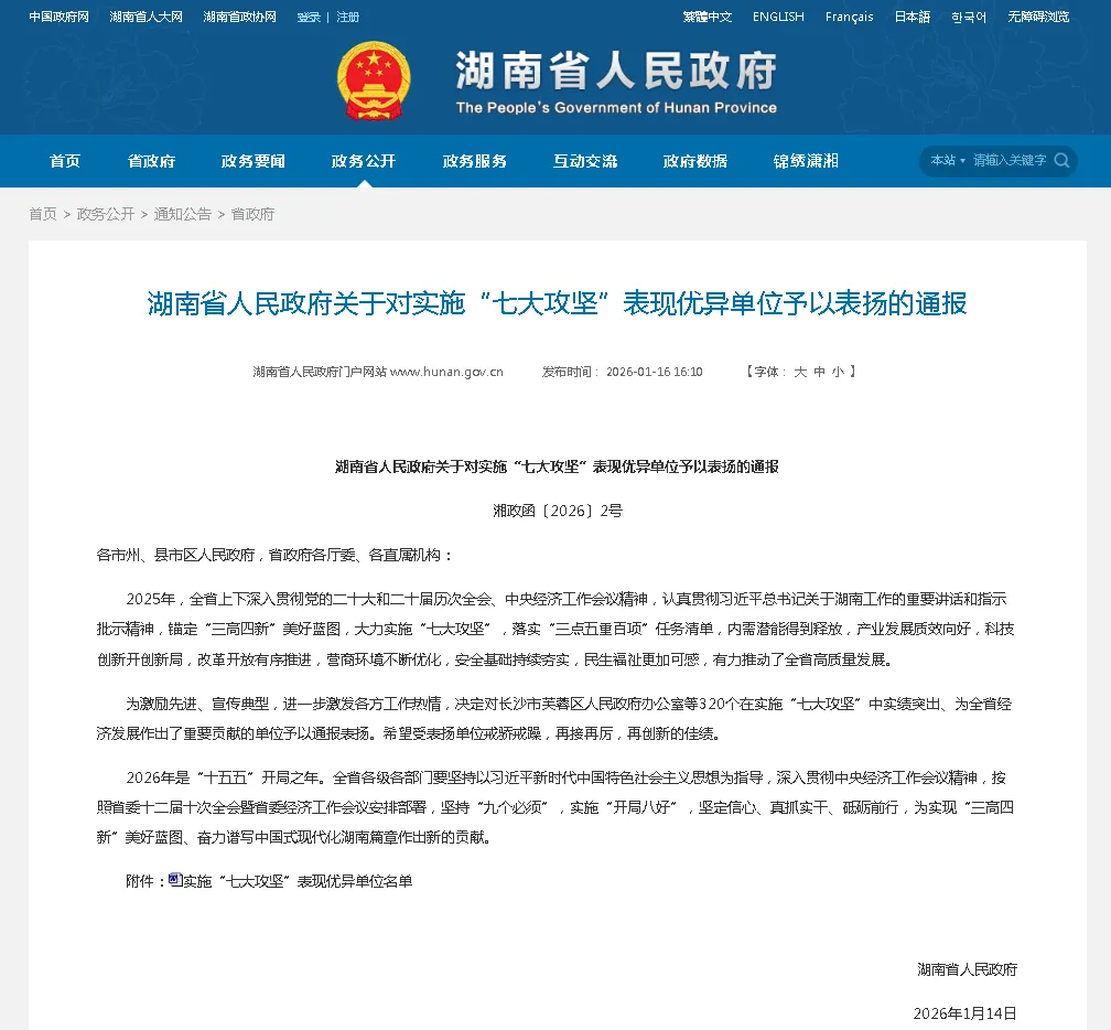 湖南省人民政府对全省实施“七大攻坚”行动中表现突出的单位予以通报表扬,