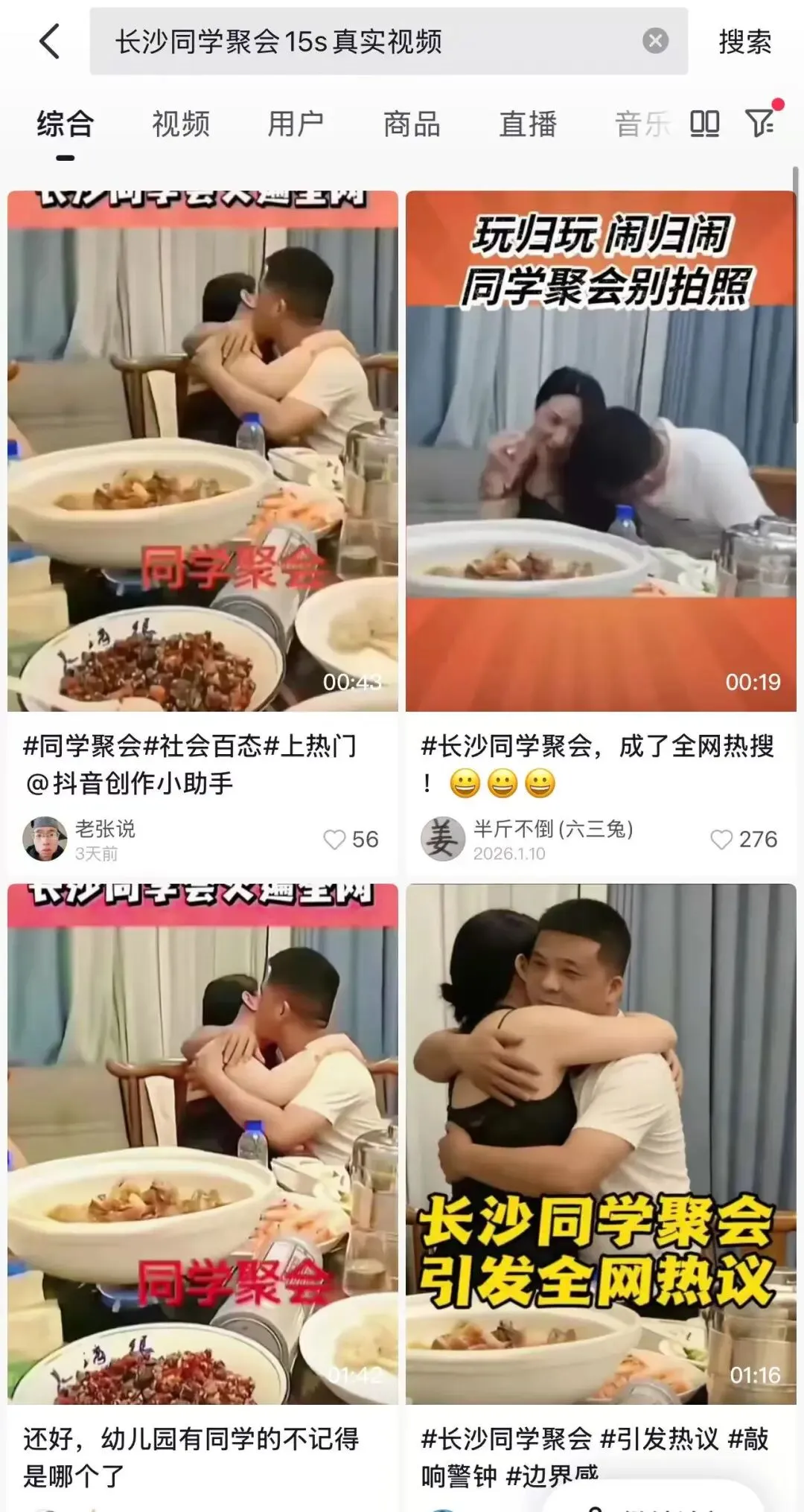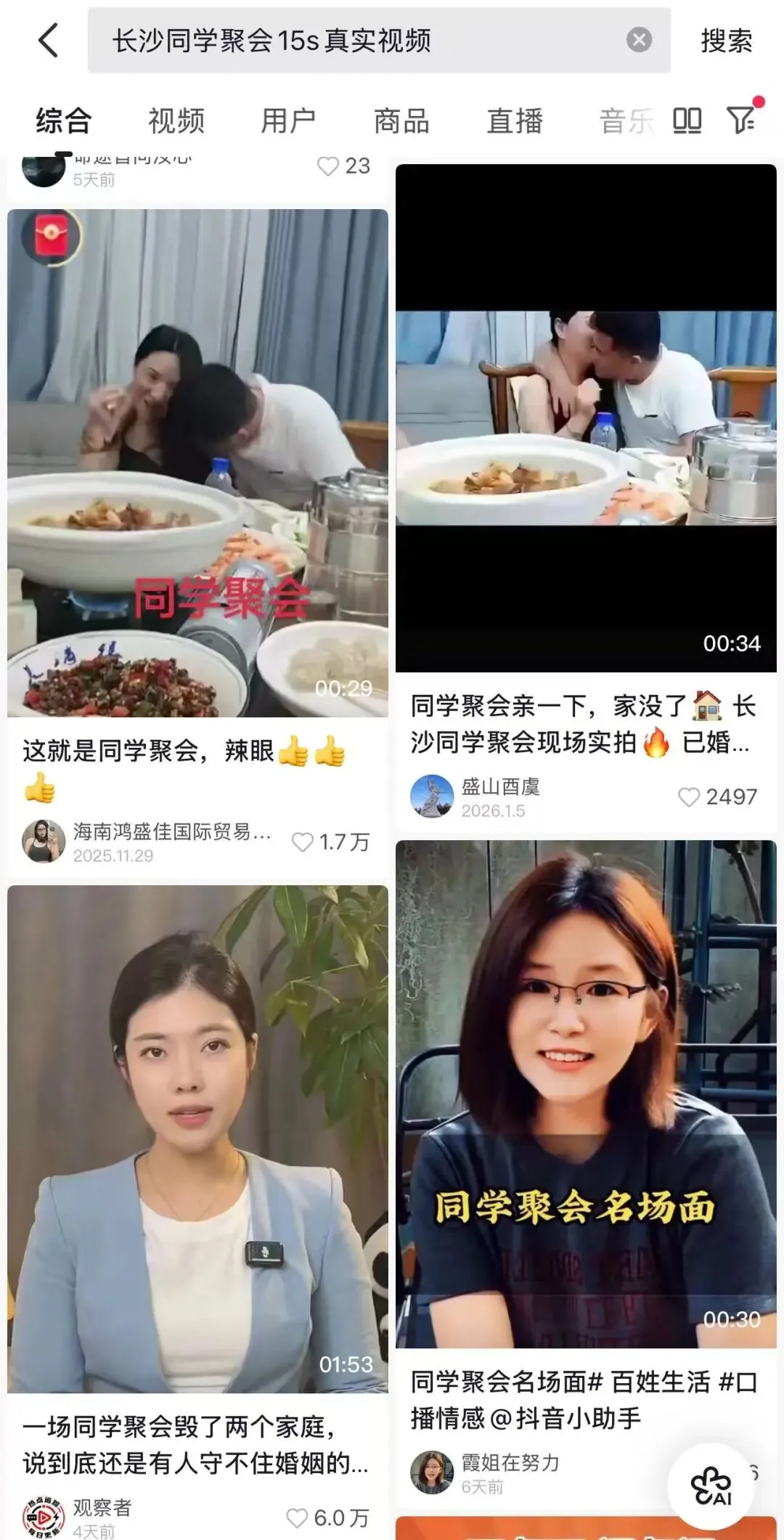 短视频平台搜索长沙同学聚会15S真实视频,出来的都是各种加工后的视频