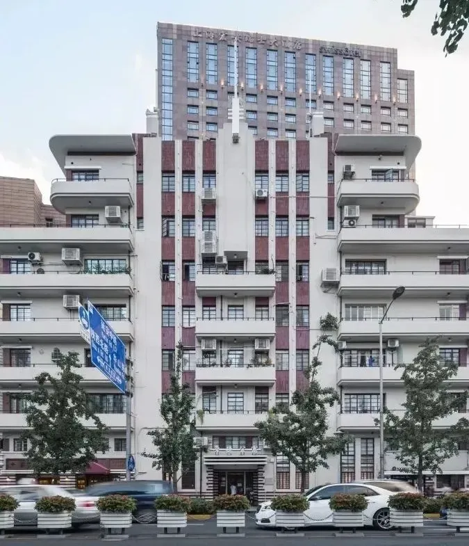 大楼占地580平方米,平面呈“凹”字形。八层的钢筋混凝土结构,在当年可算是静安寺一带的“制高点”。大楼的外立面用肉粉色进行粉刷,间以赭红横线。裙楼转角做圆弧设计,顶部两层逐步收分,整体呈现的是典型的Art-Deco“台阶式”轮廓。