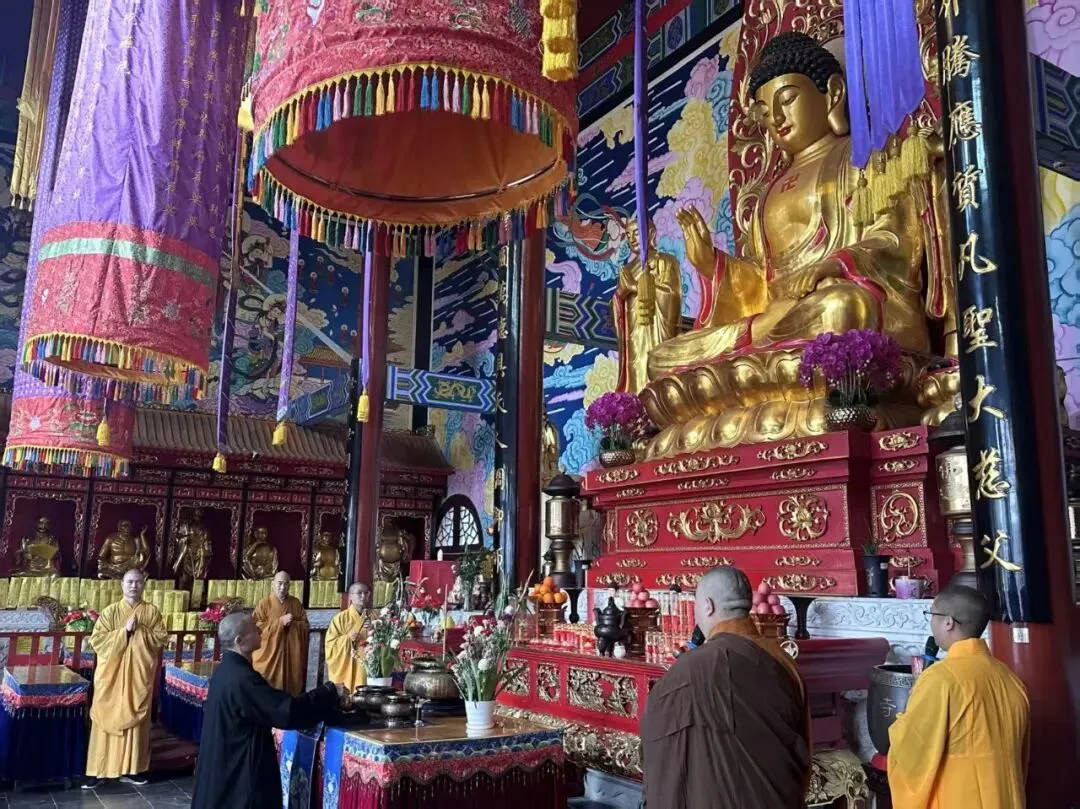 大雄宝殿内,四众弟子恭请三位大和尚开示。悟圣大和尚首先赞曰:“晟一法师住持白云寺两载,殿宇焕新、戒律整肃、信众归心,变化可谓天翻地覆!”他引《楞严经》“清净道场,感应诸佛”之教,肯定其功绩。继而叮嘱:“《梵网经》云‘戒为无上菩提本’,当以戒固僧团;《普贤行愿品》倡‘弘法利生’,当以文传佛法;《菩萨本行经》言‘慈悲济世’,当以善尽社会责任,践行佛教中国化。”
