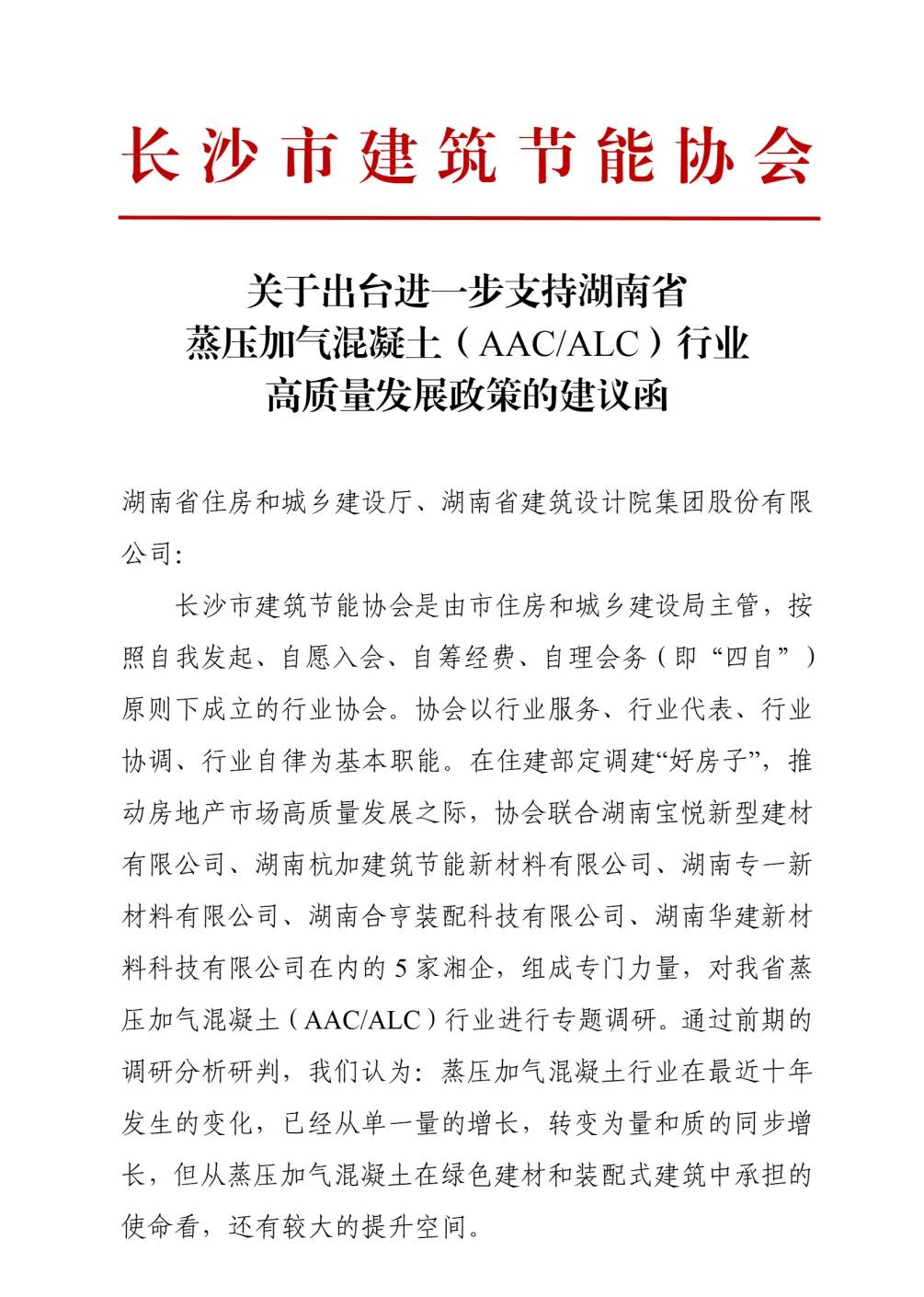 《关于出台进一步支持湖南省蒸压加气混凝土(AAC/ALC)行业高质量发展政策的建议函》