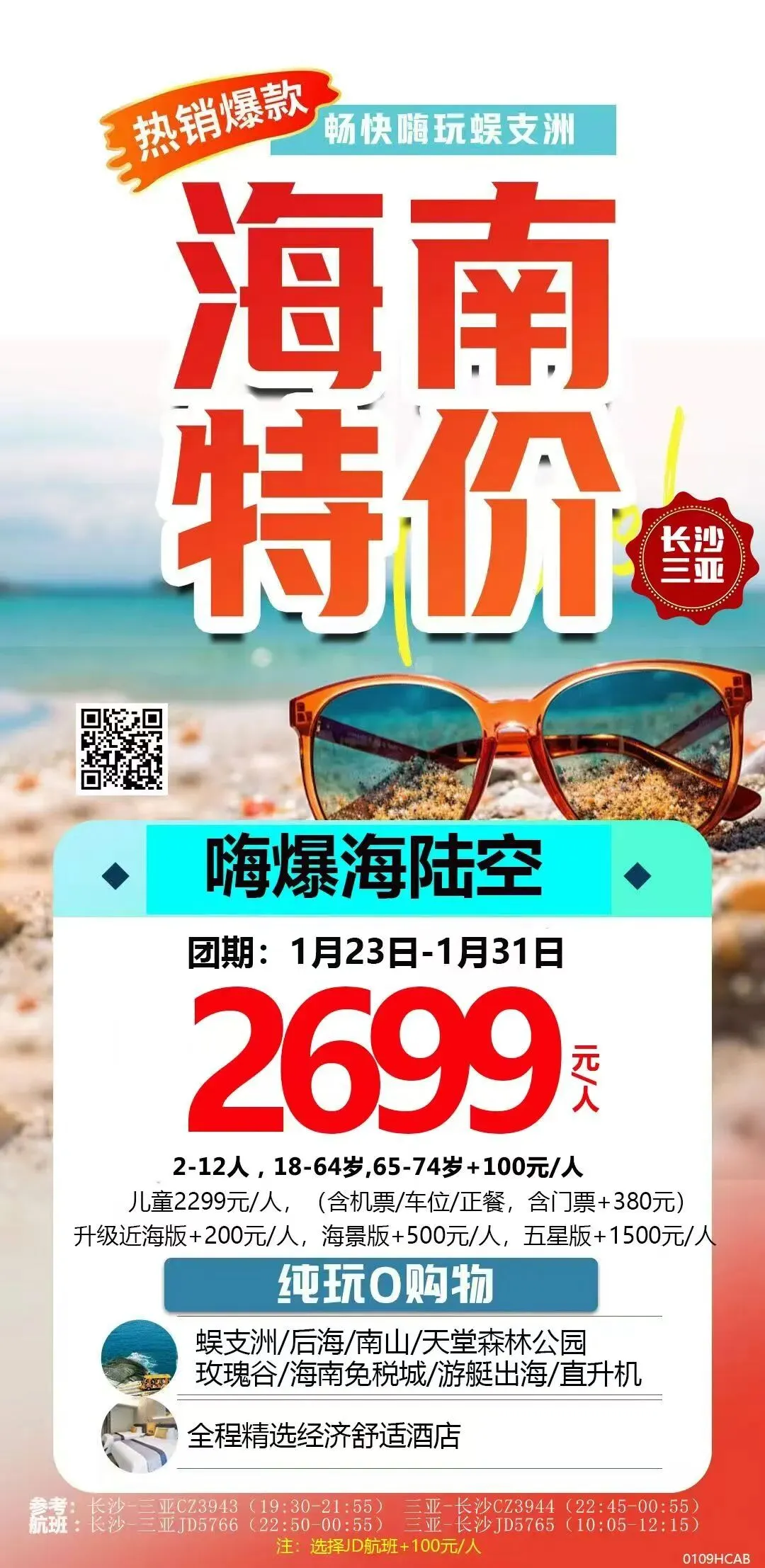 去程:长沙-三亚CZ3943(19:30-21:55)返程:三亚-长沙CZ3944 (22:45-00:55)乘机抵达“国际旅游岛”,接机员已提前在此恭候您到来,随后前往下榻酒店,沿途您可欣赏到美丽的景色。第2天