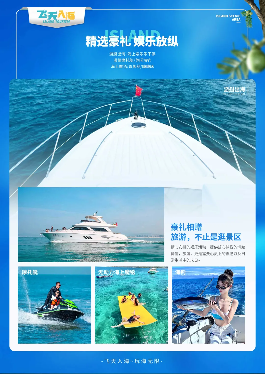 1、140尺豪华游艇3小时激情出海。2、激情摩托艇(体验1-2分钟)。3、休闲海钓(含鱼饵、渔具)。4、海上魔毯、香蕉船、蹦蹦床等海上玩具。5、免费提供:饮料(椰汁、橙汁)。6、网红船DJ电音舞会派对,海上电音大狂欢。7、免费提供热带特色水果、糖果。8、海上勇士踏浪、海天飞龙表演(欣赏)。9、免费冲淡、换衣间。10、全程资深船长和水手为您保驾护航。尊享海上欢乐时光!11、全程专业艇乘客服、金牌领队为您贴心服务及项目对接。12:全程乘客保险。注意:患有心脏病,高血压,糖尿病,哮喘病,中耳炎,癫痫病,孕妇及各心血管疾病,55岁以上老人(含55岁不赠送摩托艇票)不宜参加水上运动,如有隐瞒自身实际情况,后果自负,以上套餐项目因天气或公司经营时间问题暂停服务,可以改期,不予退票。央企运营。质量保障。全新的细节服务模式,高端奢华的游艇体验,参与感爆棚的海上狂欢,带您体验海岛热带风情不一样的海上狂欢嘉年华。