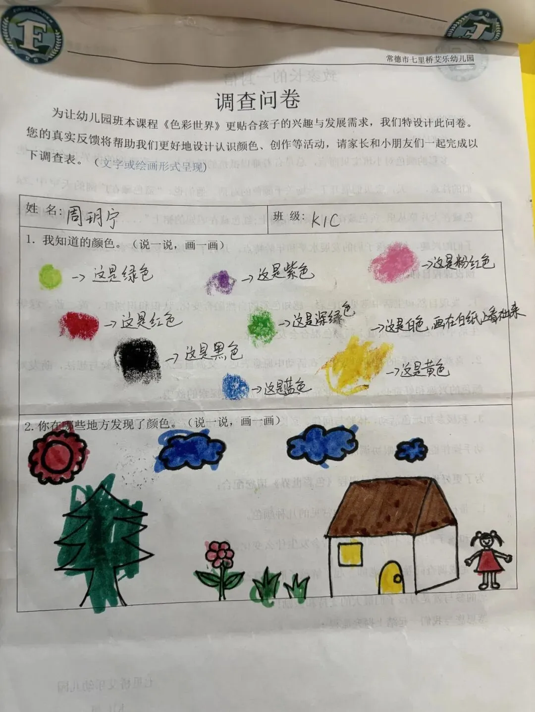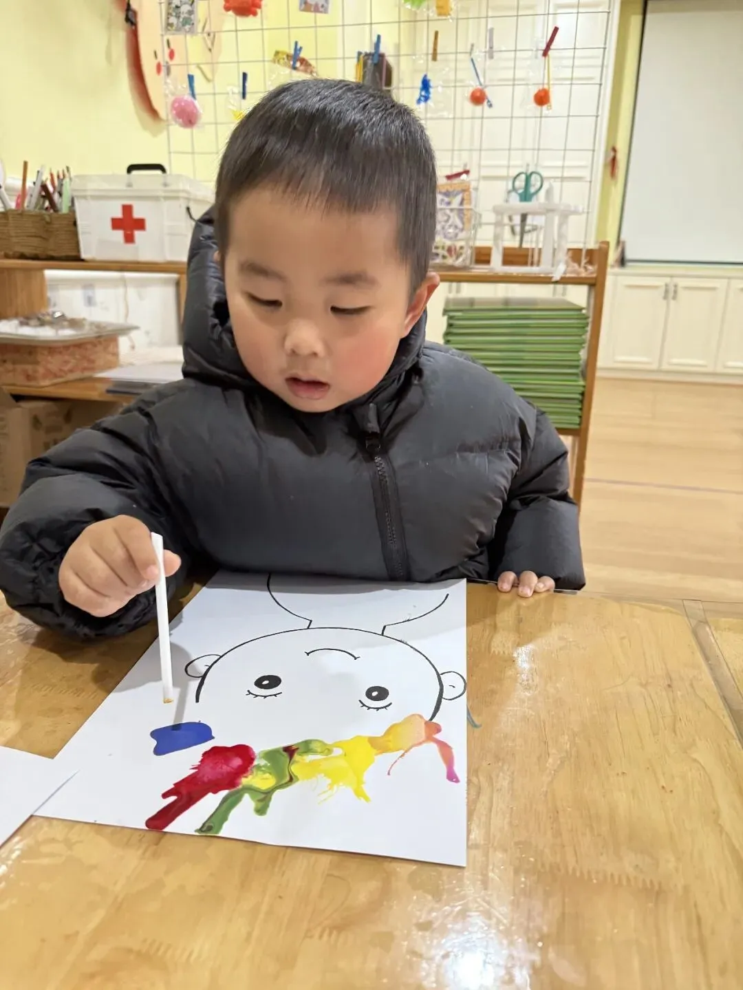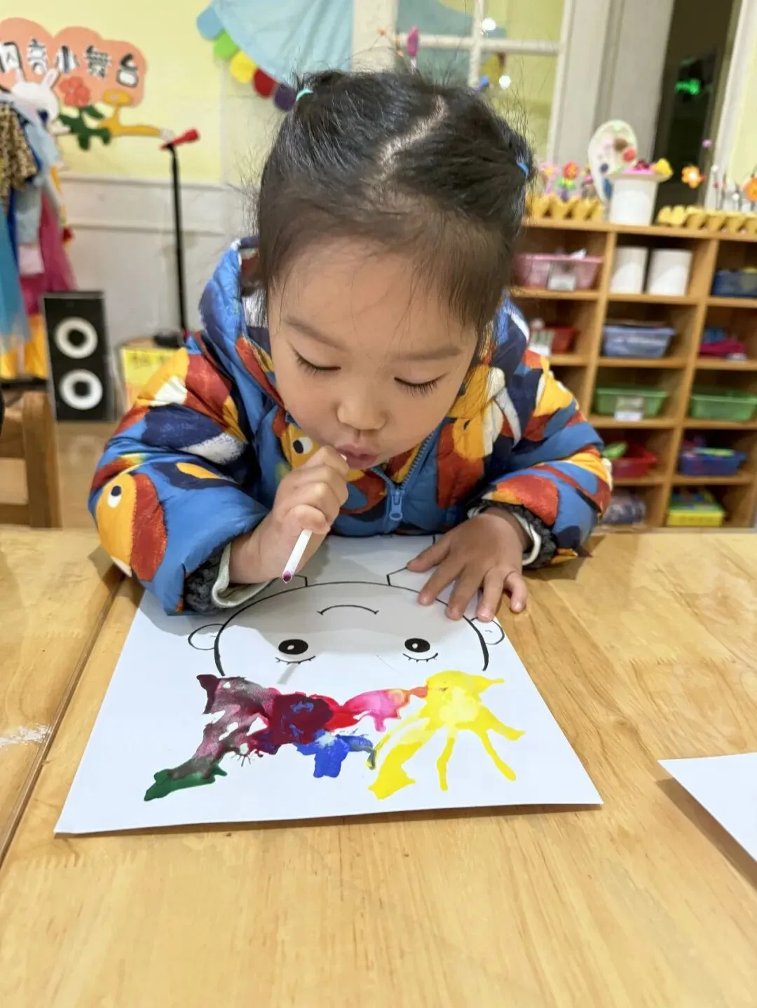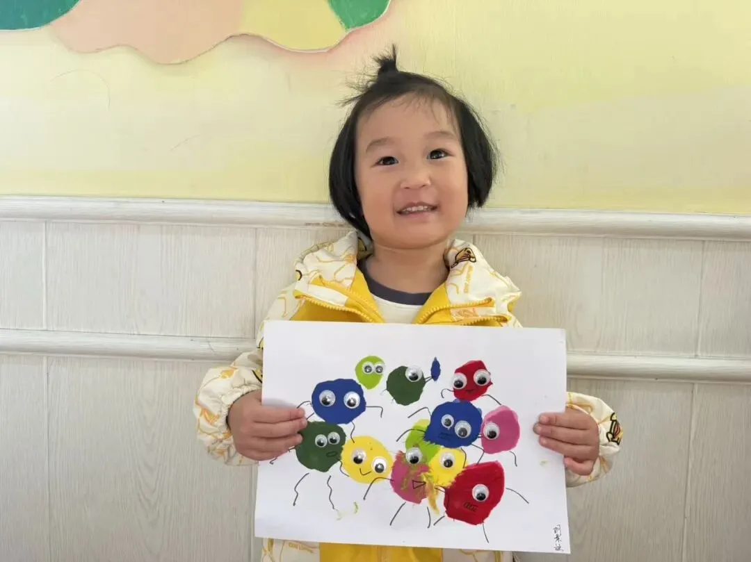 为了让孩子们能够有更多的机会感知变色带来的奇妙和体验玩色的乐趣,老师向孩子们提供了各色颜料,进行“颜色小怪兽”美术创作。