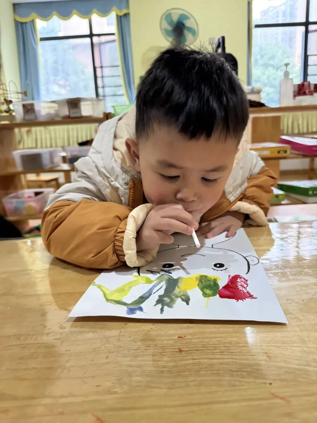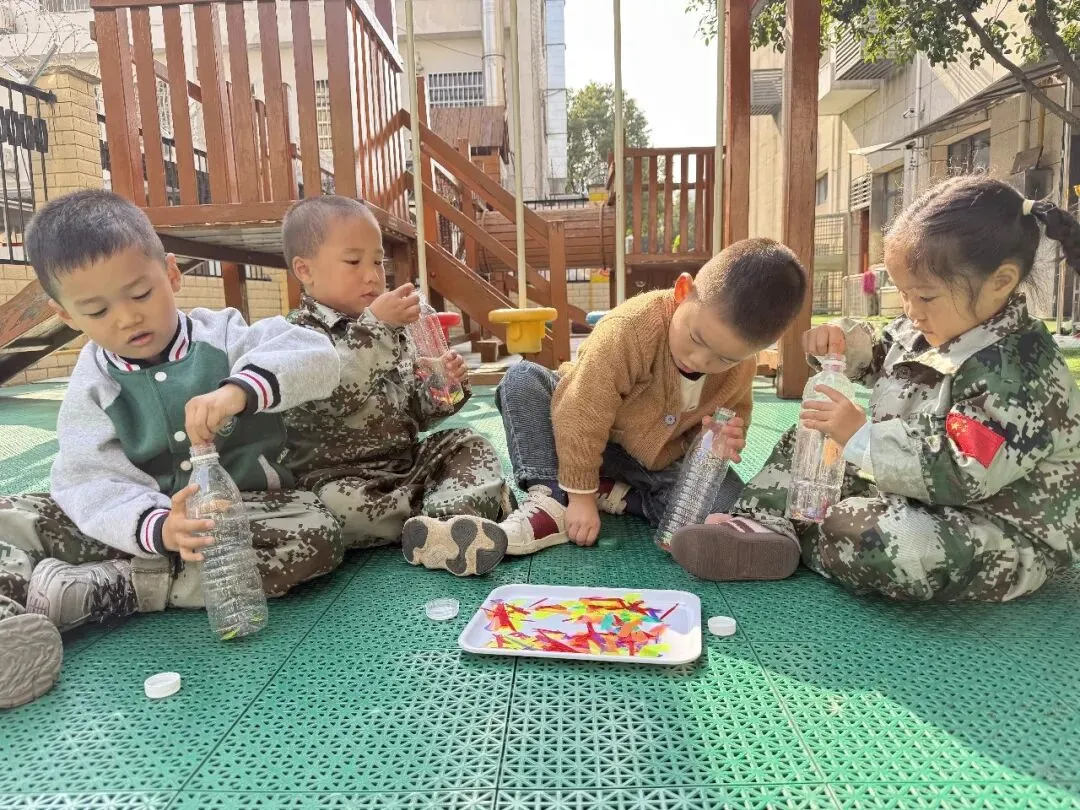 孩子们的创作以红黄蓝为基础,通过“喷绘叠加”的操作,将抽象的混色原理转化为可感知的视觉体验,不仅体现了主动学习的过程,更是对色彩混合规律的应用。