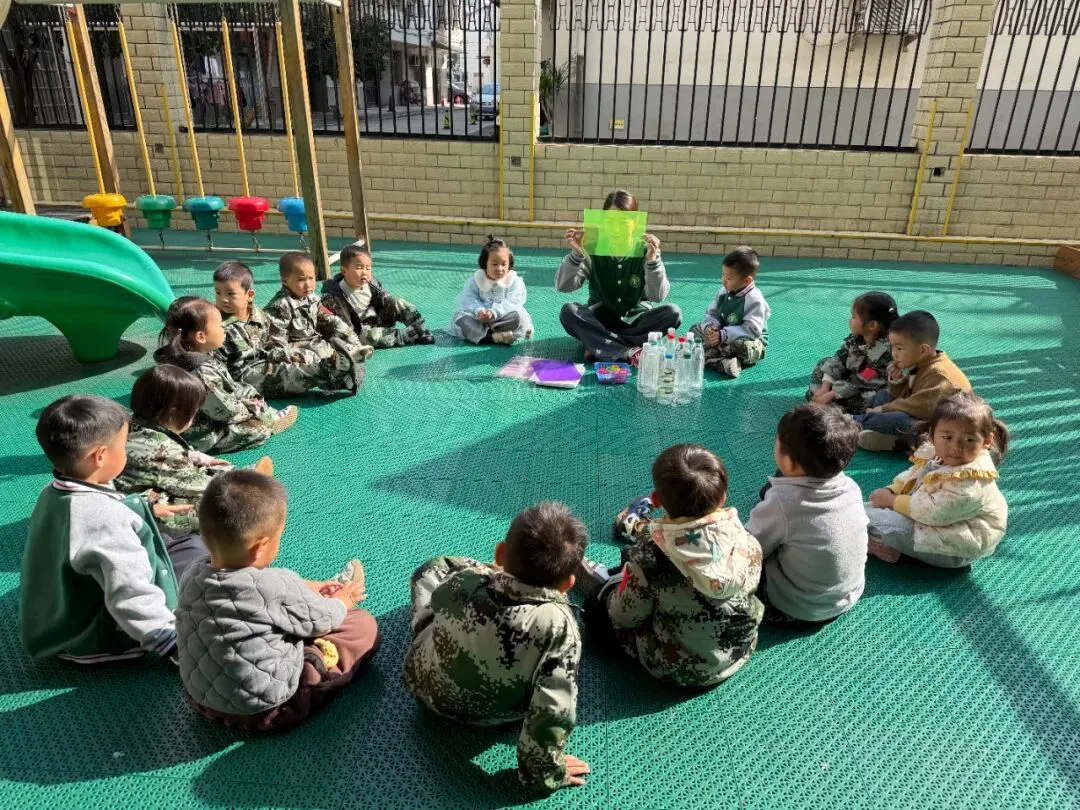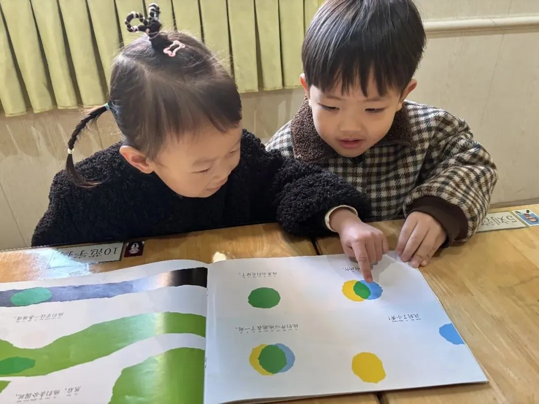 当翻到小蓝和小黄拥抱在一起变成小绿那页时,汤圆突然激动说道:“你们看!它们抱一起就变成了绿色!”这时,开心眼睛瞪得圆圆地问:“那如果是另外两种颜色拥抱呢?也会变成绿色吗?”