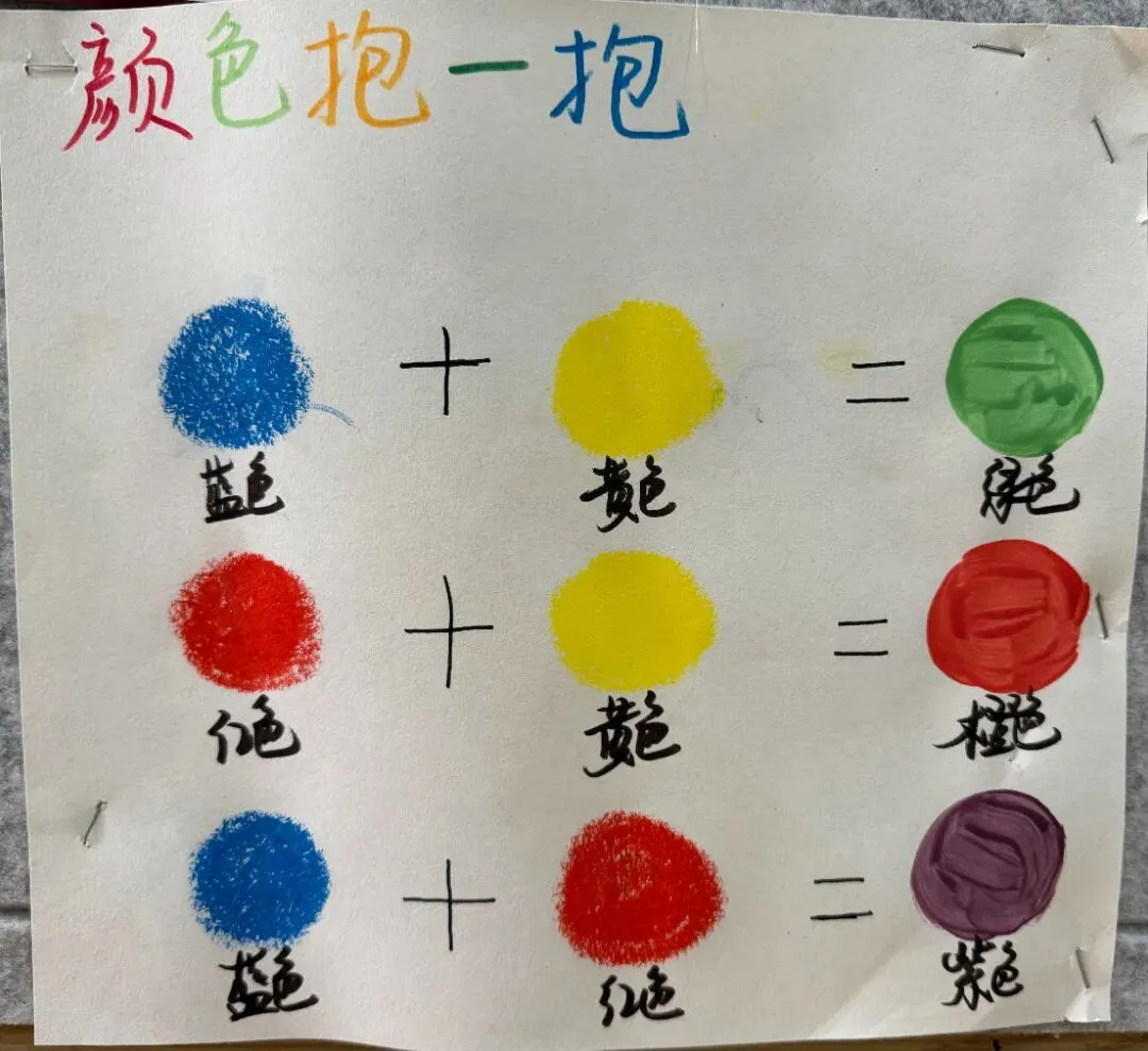 通过红、黄、蓝三种颜色的两两混合,孩子们发现了规律,师幼共同将两种颜色混合的实验结果记录了下来。