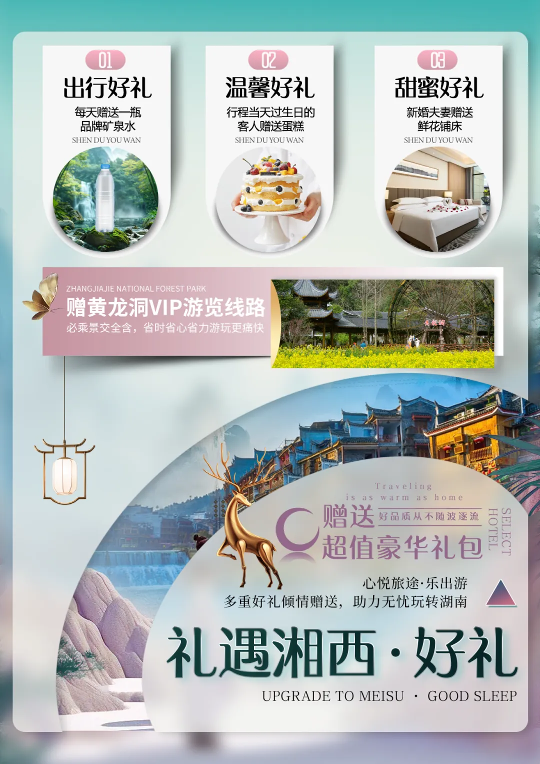 Day3:武陵源景区、张家界国家森林公园→杨家界→袁家界→金鞭溪→黄龙洞VIP→魅力湘西含餐:早晚餐 住宿:张家界早餐后全程高速前往【武陵源风景名胜区AAAAA】(核心景区大门票已含),这是我国的第一个国家森林公园,世界自然遗产,世界地质公园,首批国家AAAAA景区,游览【杨家界】(赠送杨家界索道单程贵宾通道,减少排队时间),观全球绝版【峰墙长城】,看峰林之绝;环保车抵达【袁家界核心景区】(赠送百龙电梯)《阿凡达》外景拍摄地——哈利路亚山,抵达潘多拉星球--电影《阿凡达》外景拍摄地——【哈利路亚山】探寻影视阿凡达中群山漂浮、星罗棋布的玄幻莫测世界;【天下第一桥】云雾缭绕、峰峦叠嶂、气势磅礴,大小景点应接不暇,忘却归路。