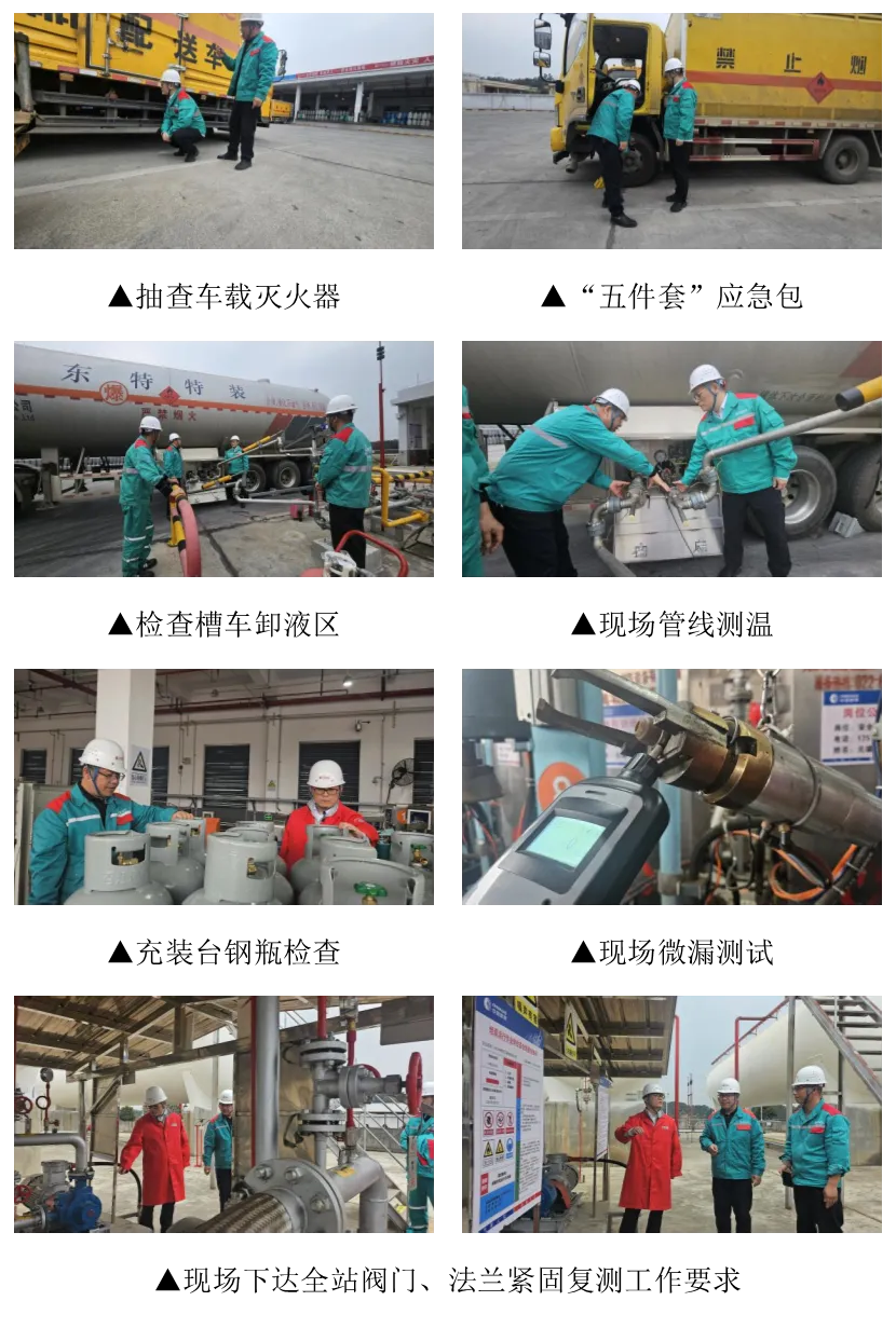 总经理杨挺在装卸区随机抽查湘AP3673配送车,车载灭火器均在有效期内,并要求配送车辆出车前必须“五件套”拍照回传,确保车辆“保供应急包”随车出行。他同时暖心叮嘱:为驾驶室配备“抗寒礼包”方便面、暖宝宝、防冻手套,实现“车辆—人员—物资”同步前置。对充装台、槽车卸液区、储罐区逐一检查,要求把“低温”当“大考”,警惕夜间低温易导致阀门法兰收缩渗漏等异常情况发生,现场抽测充装台是否存在微漏现象,现场下达“寒潮指令”:18号前完成全站阀门、法兰紧固复测;日巡2小时/次、夜巡4小时/次,发现渗漏“当爆炸风险”立即处置;若发现漏检一次,值班长就地免职。他在检查中反复强调,岁末年初是安全事故易发期,要树立“隐患即事故”理念,加强安全设施设备维护保养,对隐患问题立行立改、闭环管理。