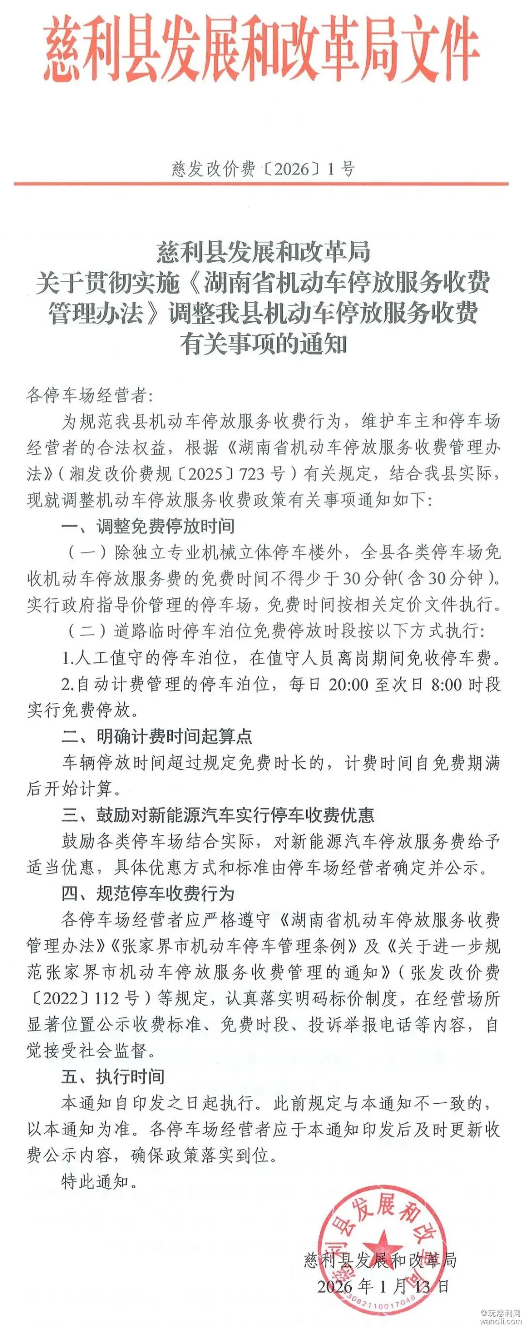 各停车场经营者: 为规范我县机动车停放服务收费行为,维护车主和停车场经营者的合法权益,根据《湖南省机动车停放服务收费管理办法》(湘发改价费规〔2025〕723号)有关规定,结合我县实际,现就调整机动车停放服务收费政策有关事项通知如下: 一、调整免费停放时间 (一)除独立专业机械立体停车楼外,全县各类停车场免收机动车停放服务费的免费时间不得少于30分钟(含30分钟)。实行政府指导价管理的停车场,免费时间按相关定价文件执行。 (二)道路临时停车泊位免费停放时段按以下方式执行: 1.人工值守的停车泊位,在值守人员离岗期间免收停车费。 2.自动计费管理的停车泊位,每日20:00至次日8:00时段实行免费停放。 二、明确计费时间起算点 车辆停放时间超过规定免费时长的,计费时间自免费期满后开始计算。 三、鼓励对新能源汽车实行停车收费优惠 鼓励各类停车场结合实际,对新能源汽车停放服务费给予适当优惠,具体优惠方式和标准由停车场经营者确定并公示。 四、规范停车收费行为 各停车场经营者应严格遵守《湖南省机动车停放服务收费管理办法》《张家界市机动车停车管理条例》及《关于进一步规范张家界市机动车停放服务收费管理的通知》(张发改价费〔2022〕112号)等规定,认真落实明码标价制度,在经营场所显著位置公示收费标准、免费时段、投诉举报电话等内容,自觉接受社会监督。 五、执行时间本通知自印发之日起执行。此前规定与本通知不一致的,以本通知为准。各停车场经营者应于本通知印发后及时更新收费公示内容,确保政策落实到位。 特此通知。