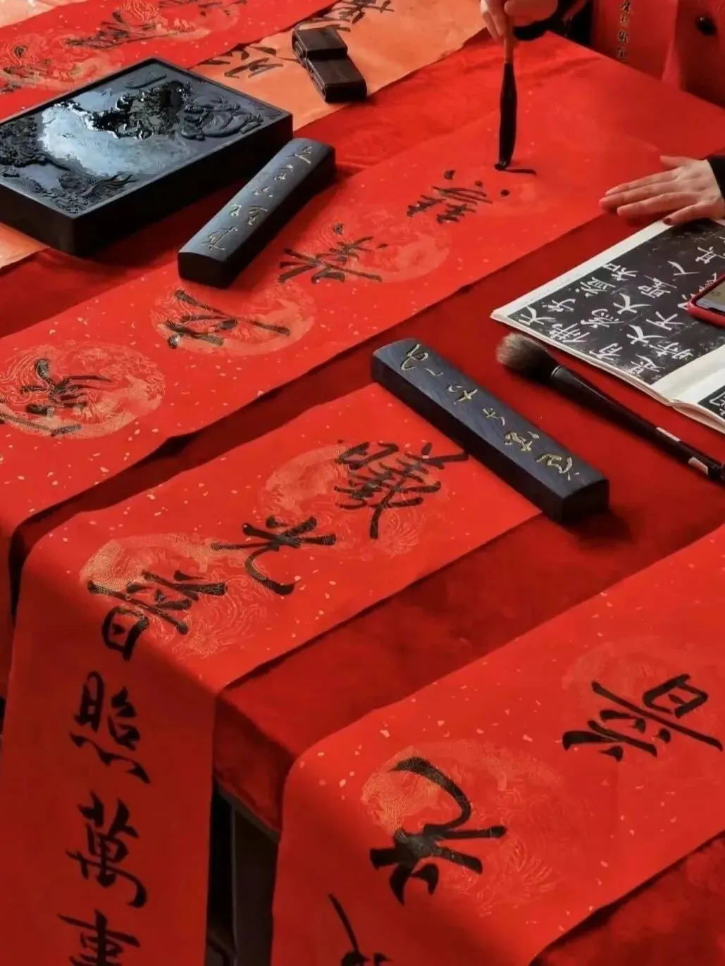 笔尖的黝黑和红色的宣纸碰撞