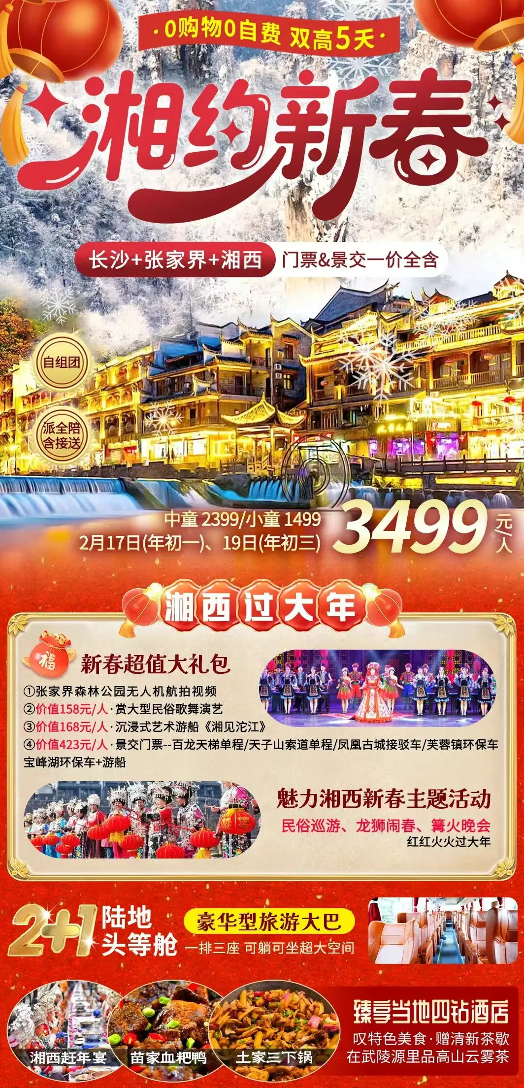 【春节自组】长沙张家界,湘西过大年!全包纯玩!天门山冰雪奇缘,寻味,千年芙蓉镇,凤凰万家灯火,赠艺术游船、睇表演,双高5天