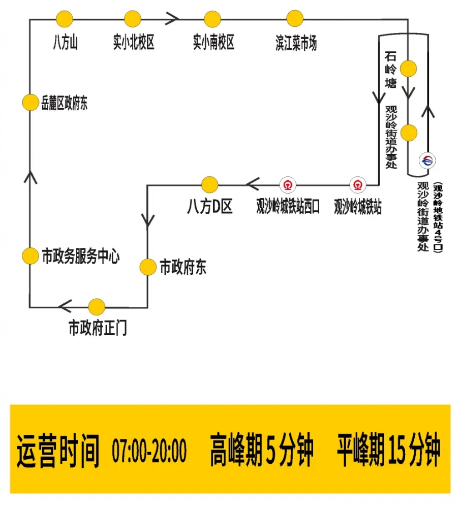 主要停靠市政务服务中心、含光路观沙路口、长沙市实验小学、观沙岭地铁站4号口、八方小区,精简非必要停靠,强化“市政务服务中心—观沙岭地铁站”直达效率(市政务服务中心站为移动站点,按需停靠市政府正门站、市政府站)。
