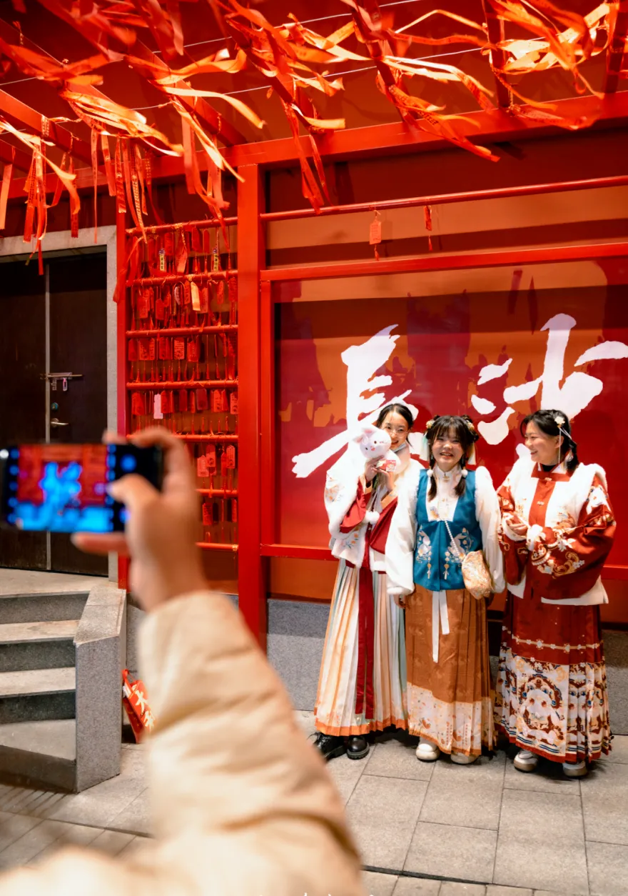 红墙绿瓦的古建筑,点缀着大红灯笼,浓浓年味