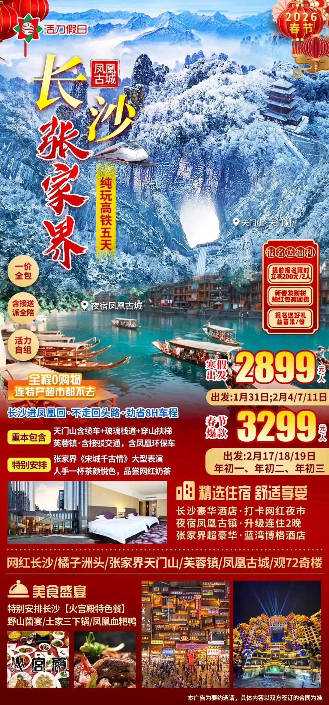 湘西最年味·一价全包·全含缆车环保车!纯玩!冰雪仙境【张家界天门山,含山谷缆车+玻璃栈道+穿山扶梯】、打卡《72层奇楼外观》、漫游网红长沙、夜宿《凤凰古城、含环保车》、打卡瀑布《芙蓉镇》、安排《宋城千古情》大型表演,连住2晚张家界蓝湾博格,高铁五天