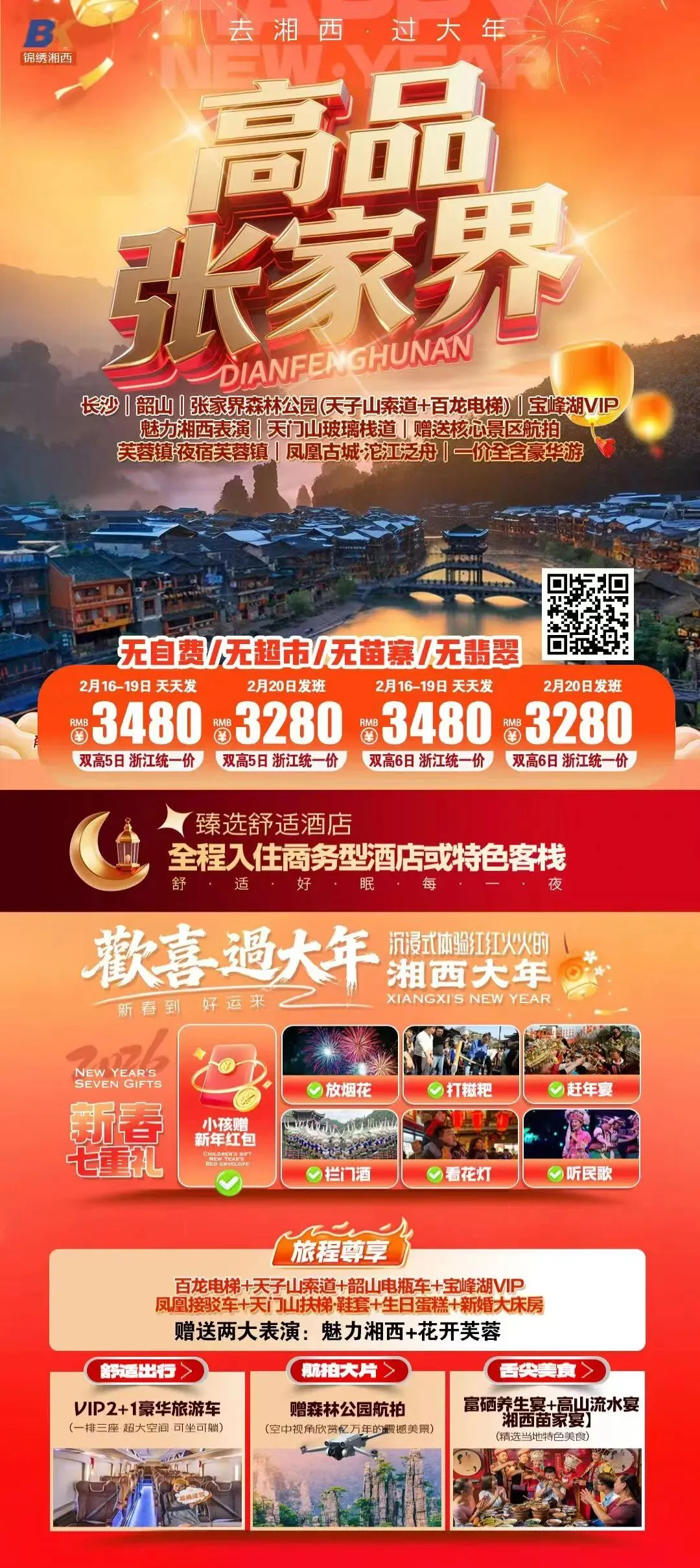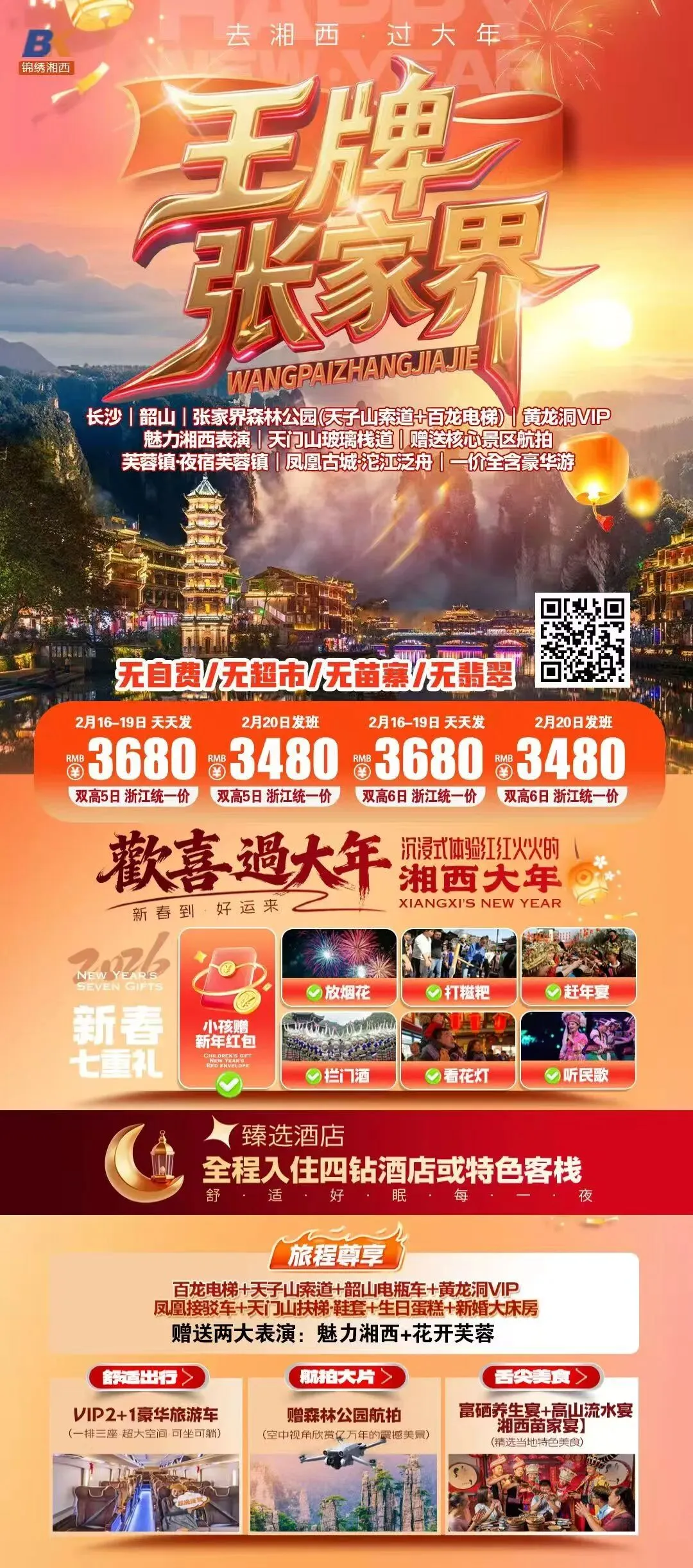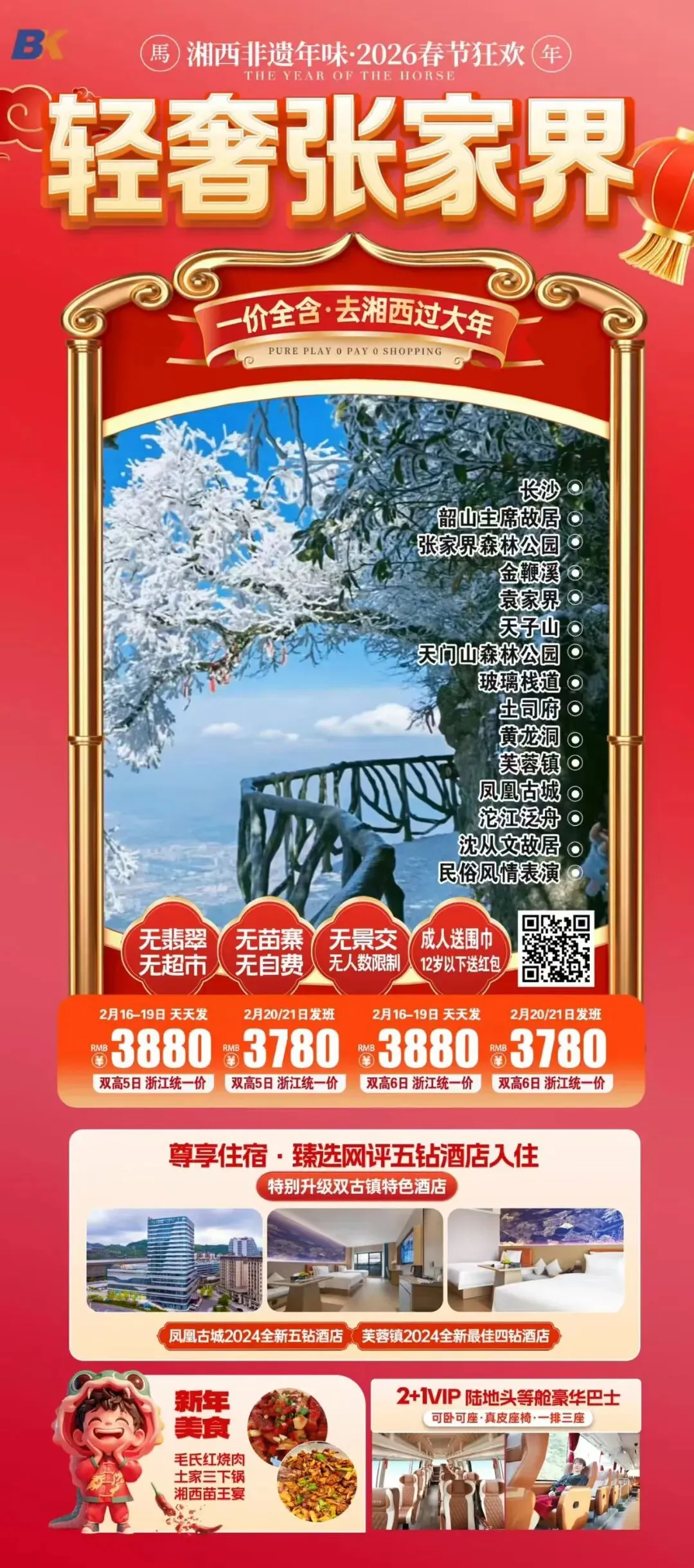 长沙张家界,湘西过大年!2月17日年初一!全包纯玩!天门时光冰雪奇缘!七十二层奇楼!2晚超豪+夜宿凤凰,环保车缆车送奶茶!千古情表演